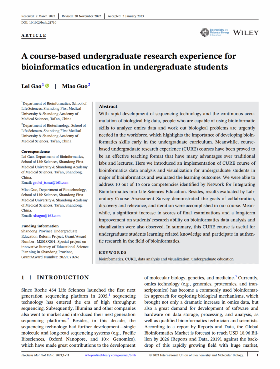 近日,生命科学学院生物信息系高蕾副教授在国际期刊Biochemistry and Molecular Biology Education(SCI收录)发表了题为《A course-based undergraduate research experience for bioinformatics education in undergraduate students》的教学研究论文,高蕾副教授为论文第一作者,郭淼教授为通讯作者。Biochemistry and Molecular Biology Education(生物化学与分子生物学教育)是生物学教育领域优质的国际期刊,发表与生物学教育教学有关的原创研究论文。