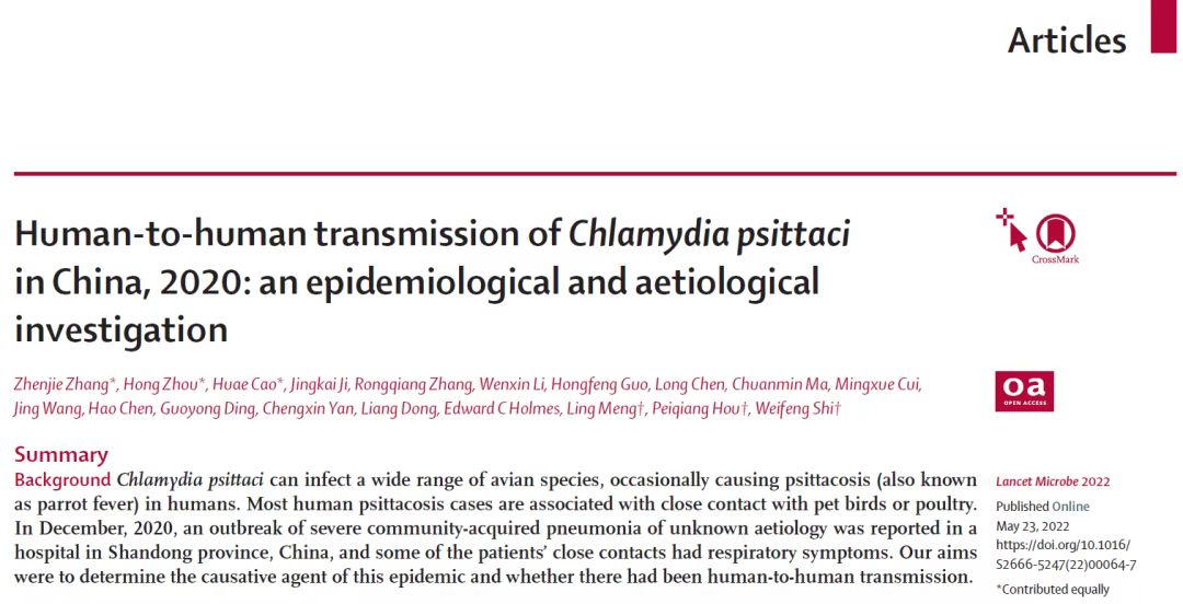 2020年12月,山东省某医院接收了不明病因的社区获得性肺炎患者,部分重症患者病情进展快速,密接者和次密接者陆续出现类似的咳嗽、流涕等呼吸道症状。研究团队对此次不明原因疫情进行了流行病学和病原学调查,明确其发病原因为鹦鹉热衣原体感染。通过整合患者流行病学和临床检测数据,研究人员确定最初6名患者为接触家禽后感染的原发病例,入院后造成多名医务人员感染,以及随后医务人员部分家庭成员感染,表明鹦鹉热衣原体可发生人际间的二代和三代传播,包括疑似无症状携带者造成的继发传播,揭示了此次疫情暴发的潜在传播链。这是中国首次关于鹦鹉热衣原体存在人际传播的报道。同时确诊了多例传染源不明的鹦鹉热患者,提示人群中存在该病原体的隐性传播风险。鉴于鹦鹉热衣原体的潜在生物安全威胁,作者呼吁将鹦鹉热衣原体纳入呼吸道病原体的常规筛查,特别是对高风险人群。