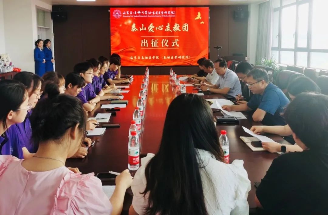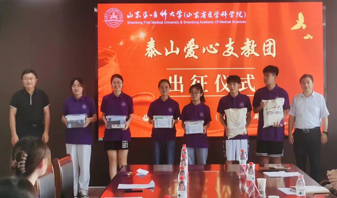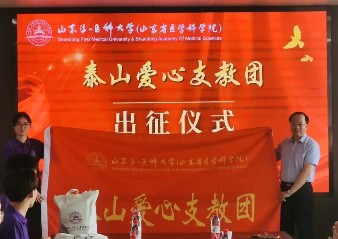 校(院)党委委员、副校(院)长李栋参加出征仪式并为支教队授旗。校(院)团委书记刘祥雨,临床与基础医学院(所)党委书记孟庆建分别代表校(院)和院(所)为支教团赠送具有山一大特色的文创产品、防暑降温箱和防暑防疫物资。院(所)党委副书记张乃强主持仪式。部分老师和支教团新老成员参加活动。