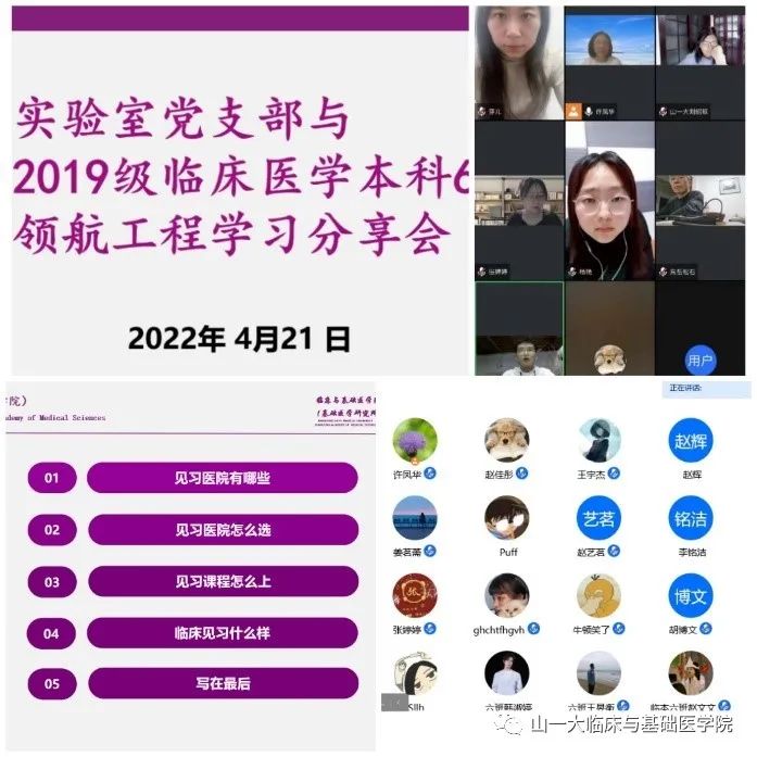 为推动“领航工程”深入开展,做好学生思想、学习引领工作,响应学校关于近期疫情防控工作要求,4月21日,临床与基础医学院(基础医学研究所)实验室党支部与2019级临床医学本科6班通过“腾讯会议”开展了线上学习分享会。活动内容包括《新冠病毒那些事》和《见习生活知多少》。