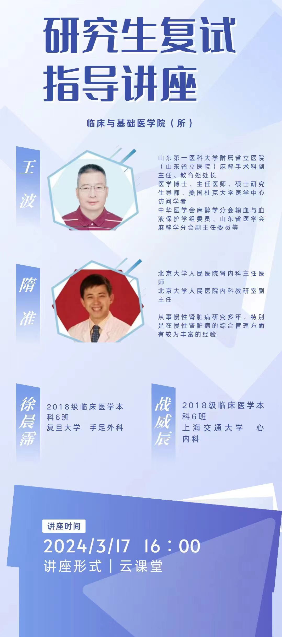 各位同学,定于今天(3月17日,周日)下午16:00通过线上的方式举办临床医学硕士研究生复试指导交流会。会议邀请到北京大学人民医院肾内科主任医师、内科教研室副主任隋准教授、百度开云体育app(山东省医学科学院)附属省立医院教育处处长王波教授,以及2023届两名优秀毕业生给大家传授考研复试经验。院(所)党委书记孟庆建、院(所)常务副院(所)长张海东、院(所)党委副书记岳芸、副院(所)长钟宁以及全体2024届业生辅导员也参与今天的交流会。请大家通知到每一位学生,抓住本次学习交流机会,为考研复试及调剂工作提质赋能。以下是会议直播链接,请大家提前五分钟进入会议室,谢谢