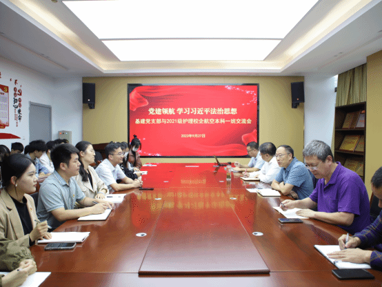 9月27日下午,基建部党支部携手2021级护理学校企合作(航空方向)本科一班全体同学共同开展以“习近平法治思想”为主题的领航工程交流会。基建部党支部党员在支部书记任志国同志带领下参加交流会。