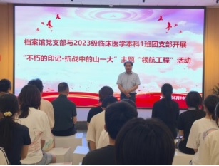 为纪念中国人民抗日战争暨世界反法西斯战争胜利80周年,深入挖掘校史红色资源,6月18日,档案馆党支部与2023级临床医学本科1班团支部共同开展“不朽的印记·抗战中的山一大”主题领航工程活动。此次活动通过档案育人、文化育人等形式,引导青年学子传承红色基因,厚植家国情怀。