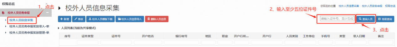 (1)通过输入证件号,点击“查询人员”,对所发放的人员进行查询,如果该人员存在且其他信息是正确的,则不用再进行该人员的信息采集。可以点击“修改”,对其中的银行卡号或错误信息进行修改。