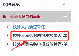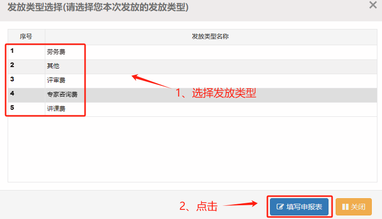 (1)点击“校外人员劳务申报发放录入-单”菜单,在弹出的“发放类型选择”界面内,选择发放类型,然后点击右下角“填写申报表”进行录入。