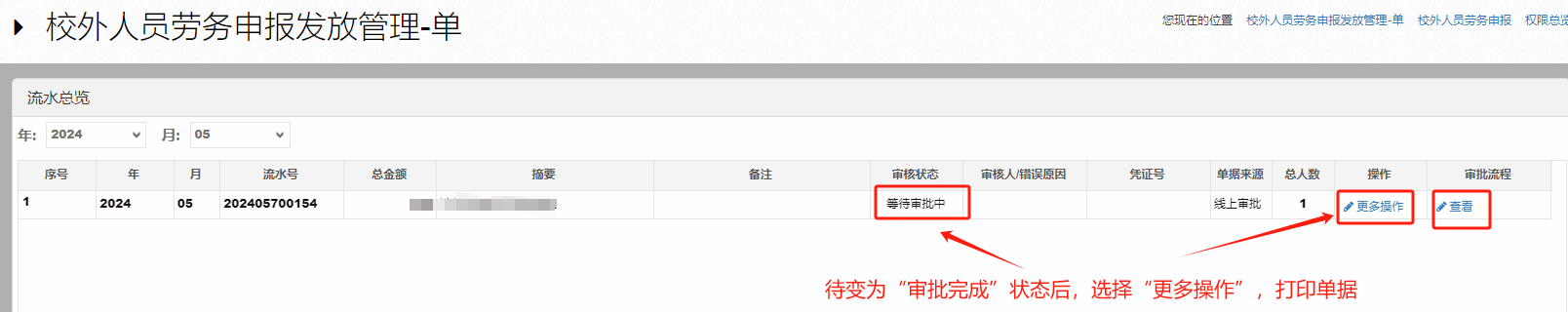点击“查看”审批流程,可以实时查询单据审批状态。单位负责人完成审批,审核状态变成“审核完成”后,选择“更多操作”,打印单据;如需要删除该笔记录,点击“删除”按钮进行删除。
