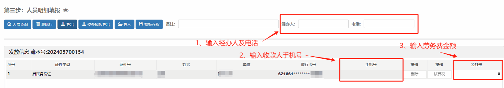 输入经办人及电话、收款人手机号,填写应发劳务费金额。