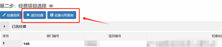点击“清空经费”对已经选择的财务项目进行删除,点击“经费占用查询”对已选财务项目的经费占用情况进行查询。