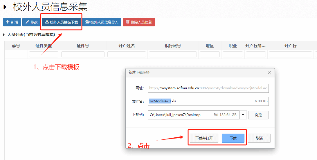 如需采集的人员过多,可采用批量的方式导入。点击“校外人员模板下载”按钮下载模板。