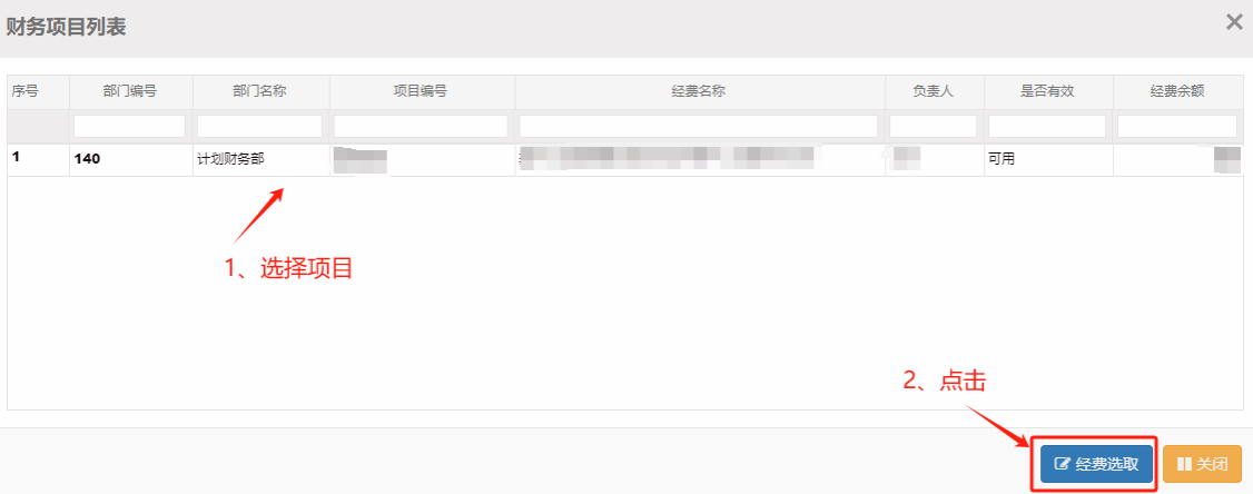 点击“经费选择”按钮,在弹出的财务项目列表中选择财务项目,点击“经费选取”确认。