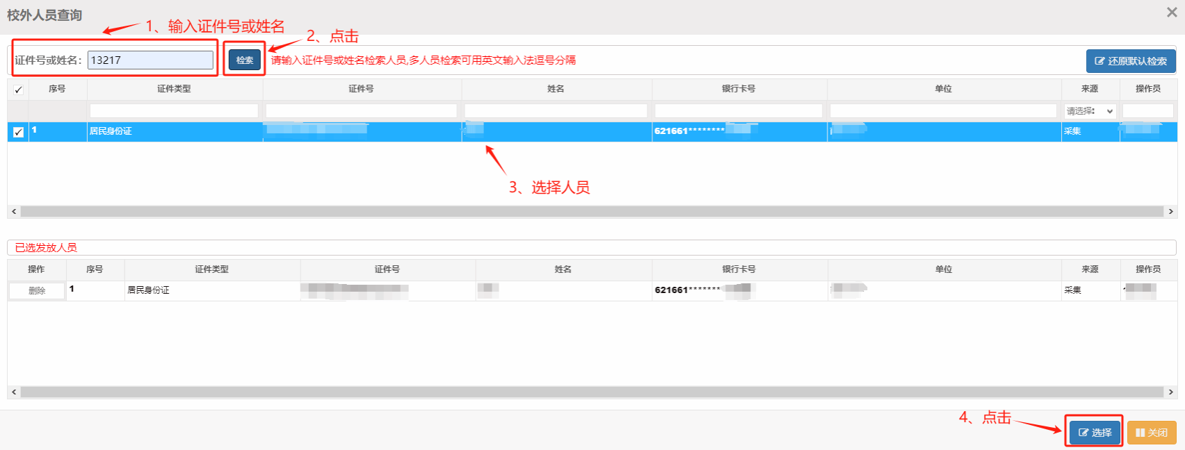 点击“人员查询”按钮,在弹出的“校外人员查询”界面内,按照证件号或姓名检索出相关人员,选择左侧方框,点击右下角“选择”进行确认。