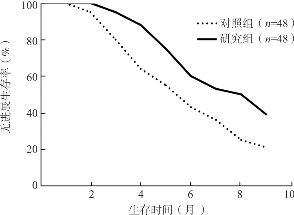 目的 观察奥拉帕尼联合贝伐珠单抗在复发性铂类敏感卵巢癌患者中的疗效、安全性以及对血清人附睾蛋白4(HE4)、糖类抗原125(CA125)和循环肿瘤细胞(CTC)水平的影响。方法 选取湖北医药学院附属东风医院2018年6月至2019年6月收治的96例复发性铂类敏感卵巢癌患者,按照随机数字表法分为对照组(n=48)和研究组(n=48)。对照组给予多柔比星脂质体联合卡铂化疗6个周期;研究组给予奥拉帕尼联合贝伐珠单抗治疗,奥拉帕尼持续给药,贝伐珠单抗治疗6个周期。评价两组患者中位无进展生存期(PFS)、客观有效率(ORR)、疾病控制率(DCR),比较两组患者治疗后血清HE4、CA125和CTC水平变化情况,观察患者治疗期间药物不良反应。结果 研究组患者中位PFS为8.3个月,长于对照组的5.5个月,差异具有统计学意义(χ 2=5.134,P=0.025)。研究组患者ORR、DCR分别为52.08%(25/48)、81.25%(39/48),显著高于对照组的31.25%(15/48)、62.50%(30/48),差异均具有统计学意义(χ2=4.286,P=0.038;χ2=4.174,P=0.041)。治疗6个周期后研究组患者血清HE4[(123.60±31.52)pmol/L vs. (178.01±46.22) pmol/L]、CA125[(33.52±10.61)U/L vs. (50.32±11.09) U/L]和CTC[(2.19±0.24)个/5 ml vs. (3.25±0.31) 个/5 ml]水平均较对照组明显下降,差异均具有统计学意义(t=8.489,P=0.025;t=7.562,P=0.032;t=9.341,P=0.017)。研究组患者的胃肠反应发生率[35.42%(17/48) vs. 64.58%(31/48)]、骨髓抑制发生率[18.75%(9/48) vs. 41.67%(20/48)]、肝肾功能损伤发生率[2.08%(1/48) vs. 14.58%(7/48)]、心脏毒性发生率[4.17%(2/48) vs.18.75%(9/48)]、过敏反应发生率[0(0) vs. 8.33%(4/48)]、神经系统毒性发生率[2.08%(1/48) vs.16.67%(8/48)]等不良反应显著低于对照组,差异均具有统计学意义(χ2=8.167,P=0.004;χ2=7.584,P=0.006;χ2=4.909,P=0.027;χ2=5.031,P=0.025;χ2=4.174,P=0.041;χ2=6.008,P=0.014)。结论 对于复发性铂类敏感卵巢癌患者,奥拉帕尼联合贝伐珠单抗疗效优于多柔比星脂质体联合卡铂化疗,并可延长患者生存期,下调血清HE4、CA125和CTC水平,不良反应发生率低。