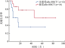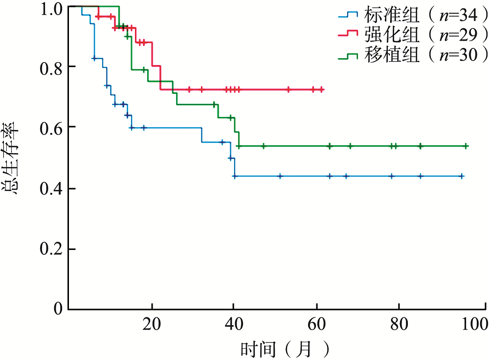 目的分析成人急性淋巴细胞白血病(ALL)患者诱导治疗完全缓解后接受不同巩固治疗方案的生存情况及预后影响因素。方法纳入北京大学深圳医院2012年1月至2019年6月收治的93例成人ALL患者,所有患者经VDLCP方案诱导治疗达完全缓解,根据巩固治疗方案分为标准组、强化组及移植组。标准组34例,接受VDLCP或Hyper-CVAD方案为基础的ALL样方案巩固4~6个疗程;强化组29例,接受BFM90/95方案巩固维持治疗2年;移植组30例,经原诱导方案巩固2~3疗程,接受异基因造血干细胞移植(allo-HSCT)。中位随访时间18(3~96)个月,主要随访指标为总生存期(OS)及无瘤生存期(DFS)。分析成人ALL患者的预后影响因素及各组治疗相关死亡情况。结果标准组、强化组和移植组3年OS率分别为54.0%(95%CI为35.3%~72.6%)、71.8%(95%CI为41.0%~94.5%)、62.3%(95%CI为43.6%~80.9%),差异有统计学意义(χ2=6.110,P=0.047);3年DFS率分别为31.4%(95%CI为12.9%~49.8%)、72.1%(95%CI为52.3%~91.9%)、65.7%(95%CI为45.3%~86.1%),差异有统计学意义(χ2=13.831,P=0.001);强化组和移植组OS及DFS差异均无统计学意义(χ2=0.709,P=0.400;χ2=0.046,P=0.830),强化组OS及DFS显著优于标准组(χ2=5.346,P=0.021;χ2=10.326,P=0.010)。多因素分析提示化疗第14~21天骨髓微小残留病(MRD)转阴为影响成人ALL的独立预后因素(HR=0.114,95%CI为0.015~0.841,P=0.033)。接受与未接受allo-HSCT的Ph+ALL患者3年OS率分别为53.5%(95%CI为23.1%~83.8%)、52.4%(95%CI为23.8%~81.0%),3年DFS率分别为77.1%(95%CI为54.2%~100.0%)、35.0%(95%CI为4.8%~65.2%),两组比较差异均无统计学意义(χ2=3.600,P=0.223;χ2=3.824,P=0.050)。非移植组(标准组+强化组)和移植组治疗相关死亡率分别为3.2%(2/63)、20.0%(6/30),非移植组治疗相关死亡率明显低于移植组(χ2=7.318,P=0.007)。结论成人ALL预后差,采用BFM方案强化巩固治疗3年OS率、3年DFS率均优于标准巩固治疗,达到了与allo-HSCT相似的疗效,而治疗相关死亡率没有显著升高。化疗第14~21天骨髓MRD转阴患者OS、DFS更优。