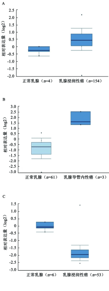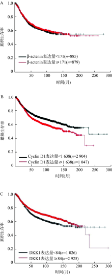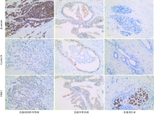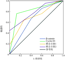 目的 检测Wnt信号通路相关分子β-catenin、细胞周期蛋白D1(Cyclin D1)、Dickkopf-1(DKK1)在乳腺疾病组织中的表达差异,探讨其在乳腺癌病理辅助诊断中的应用价值。方法 收集广州医科大学附属肿瘤医院2008年1月至2019年8月手术切除的乳腺组织标本90例,其中乳腺增生症30例、乳腺导管内癌30例、乳腺浸润性导管癌30例。免疫组织化学法检测β-catenin、Cyclin D1、DKK1在各组乳腺组织中的表达。利用Oncomine数据库和KM plotter数据库分析β-catenin、Cyclin D1、DKK1在乳腺癌与正常乳腺组织中的表达差异及其与乳腺癌生存预后的关系,并用以验证免疫组织化学结果。应用受试者工作特征(ROC)曲线评估各分子的病理辅助诊断效能。结果 在乳腺增生症、乳腺导管内癌和乳腺浸润性导管癌中,β-catenin、Cyclin D1、DKK1的表达差异均有统计学意义(χ2=7.766,P=0.021;χ2=24.133,P<0.001;χ2=11.585,P=0.003)。β-catenin在乳腺浸润性导管癌组中的表达显著高于乳腺导管内癌组和乳腺增生症组(Z=-2.367,P=0.018;Z=-2.462,P=0.014);Cyclin D1在乳腺浸润性导管癌组和乳腺导管内癌组中的表达显著高于乳腺增生症组(Z=-4.166,P<0.001;Z=-4.174,P<0.001);DKK1在乳腺浸润性导管癌组和乳腺导管内癌组中的表达显著高于乳腺增生症组(Z=-3.090,P=0.002;Z=-2.923,P=0.003)。生物信息学分析结果显示,与正常乳腺组织相比,β-catenin mRNA在乳腺浸润性癌组织中表达升高2.33倍(t=15.242,P<0.001),Cyclin D1 mRNA在乳腺导管内癌组织中表达升高6.64倍(t=7.152,P=0.006);DKK1 mRNA在正常乳腺组织中表达较乳腺浸润性癌组织升高3.41倍,差异无统计学意义(t=-13.193,P>0.999);Cyclin D1高表达组乳腺癌患者中位生存期173.2个月,短于低表达组的228.9个月(P<0.001);DKK1高表达组患者上四分位数生存期55.1个月,长于低表达组的40.4个月(P<0.001)。将乳腺浸润性导管癌与乳腺导管内癌合并为肿瘤组,以β-catenin和Cyclin D1的免疫组织化学评分之和减去DKK1的免疫组织化学评分作为联合评分方案1,以β-catenin和Cyclin D1的免疫组织化学评分之和作为联合评分方案2,ROC曲线分析结果显示,β-catenin、Cyclin D1、联合方案1和联合方案2病理辅助诊断乳腺癌的曲线下面积(AUC)分别为0.65(P=0.080)、0.81(P<0.001)、0.70(P=0.023)和0.78(P=0.001),其中Cyclin D1和联合方案2的AUC均≥0.7,具有良好的病理辅助诊断价值。结论 Wnt信号通路相关分子Cyclin D1及Cyclin D1联合β-catenin检测对乳腺癌具有良好的病理辅助诊断价值。