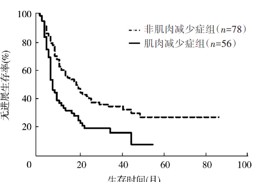 目的 探究肌肉减少症与接受根治性放疗的老年食管癌患者疗效及预后的关系。方法 回顾性分析2013年1月至2018年12月就诊于扬州大学附属医院放疗科进行根治性放疗的134例老年食管癌患者的临床病理资料。使用计算机断层扫描后的CT图像测量第3腰椎水平处的肌肉横截面积。根据放疗前骨骼肌指数将患者分为肌肉减少症组(n=56)和非肌肉减少症组(n=78)。比较两组患者的疗效及不良反应发生情况。采用Kaplan-Meier法绘制生存曲线,通过Cox回归模型分析预后影响因素。结果 肌肉减少症组患者和非肌肉减少症组患者在根治性放疗结束后1个月的客观缓解率分别为53.57%(30/56)、71.79%(56/78),差异有统计学意义(χ2=4.71,P=0.030)。两组的疾病控制率分别为94.64%(53/56)、91.03%(71/78),差异无统计学意义(χ2=0.21,P=0.651)。肌肉减少症组和非肌肉减少症组患者不良反应总发生率分别为67.86%(38/56)、47.44%(37/78),差异有统计学意义(χ2=5.52,P=0.019)。至随访结束,134例接受根治性放疗的老年食管癌患者1、3和5年生存率分别为91.0%、73.1%、55.2%。肌肉减少症组和非肌肉减少症组患者中位总生存期(OS)分别为14个月、26个月,差异有统计学意义(χ2=9.84,P=0.002);两组患者中位无进展生存期(PFS)分别为7个月、18个月,差异有统计学意义(χ2=9.91,P=0.002)。单因素分析显示,cT分期(HR=2.45,95%CI为1.26~4.74,P=0.008)、cN分期(HR=1.63,95%CI为1.06~2.50,P=0.027)、cTNM分期(HR=2.04,95%CI为1.28~3.27,P=0.003)、体质量指数(BMI)(HR=2.23,95%CI为1.01~4.90,P=0.046)、放疗前肌肉减少症(HR=2.45,95%CI为1.27~4.72,P=0.007)和化疗(HR=0.30,95%CI为0.11~0.83,P=0.020)是患者OS的预后影响因素;cT分期(HR=2.27,95%CI为1.18~4.39,P=0.015)、cN分期(HR=1.61,95%CI为1.04~2.47,P=0.030)、cTNM分期(HR=1.90,95%CI为1.19~3.02,P=0.007)、BMI(HR=1.98,95%CI为1.06~3.79,P=0.032)、放疗前肌肉减少症(HR=1.79,95%CI为1.06~3.04,P=0.031)和不良反应(HR=0.60,95%CI为0.38~0.97,P=0.037)是患者PFS的预后影响因素。多因素分析显示,放疗前肌肉减少症(HR=1.91,95%CI为1.22~3.00,P=0.005)是患者OS的独立预后因素;BMI(HR=1.80,95%CI为1.03~3.15,P=0.039)和放疗前肌肉减少症(HR=2.00,95%CI为1.27~3.14,P=0.003)是患者PFS的独立预后因素。结论 放疗前的肌肉减少症是接受根治性放疗老年食管癌患者评价预后的有效预测指标,发生肌肉减少症的患者从治疗中获益小。