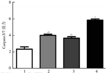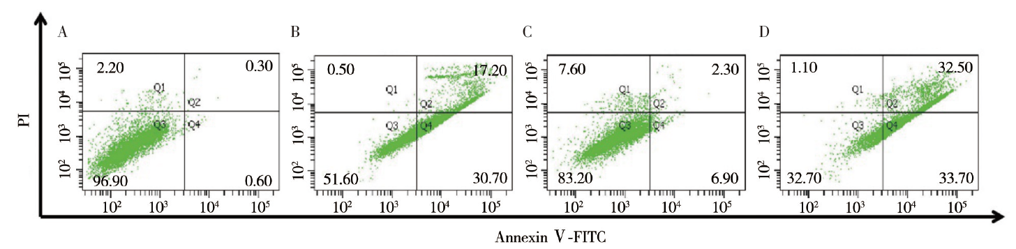 摘要:目的探究金松双黄酮联合CK2抑制剂CX-4945对脑胶质母细胞瘤U87细胞增殖与凋亡的影响及作用机制。方法体外培养脑胶质母细胞瘤U87细胞,分别用0.01、0.10、1.00、10.00、100.00 μmol/L浓度的金松双黄酮处理U87细胞;用1.25、2.50、5.00、10.00、20.00 μmol/L浓度的CX-4945处理U87细胞。将U87细胞分为对照组(不做任何处理)、金松双黄酮组(100.00 μmol/L金松双黄酮)、CX-4945组(5.00 μmol/L CX-4945)、金松双黄酮联合CX-4945组(100.00 μmol/L金松双黄酮+5.00 μmol/L CX-4945)。采用MTT法检测细胞存活率;Caspase3/7活力检测法和Annexin Ⅴ/ PI双染法检测细胞凋亡情况;蛋白质印迹法检测100.00 μmol/L金松双黄酮处理U87细胞后Notch1通路相关蛋白ICN1、HES1和DLL3表达情况。结果0、0.01、0.10、1.00、10.00、100.00 μmol/L浓度的金松双黄酮处理U87细胞存活率分别为(100.00±6.30)%、(112.02±7.63)%、(140.84±6.73)%、(113.92±7.92)%、(102.60±7.12)%、(73.16±2.74)%,差异具有统计学意义(F=55.21,P<0.001);0 μmol/L与0.01、0.10、1.00、100.00 μmol/L浓度时的细胞存活率差异均具有统计学意义(P=0.009;P<0.001;P=0.003;P<0.001)。100.00 μmol/L浓度时的金松双黄酮可抑制U87细胞活性,而其他浓度则表现为U87细胞活性的增强或无明显作用。0、1.25、2.50、5.00、10.00、20.00 μmol/L浓度的CX-4945处理U87细胞存活率分别为(100.00±5.53)%、(108.70±10.24)%、(93.14±2.82)%、(81.46±4.92)%、(56.92±3.99)%、(31.24±2.67)%,差异具有统计学意义(F=135.18,P<0.001);0 μmol/L与1.25、5.00、10.00、20.00 μmol/L浓度时的差异均具有统计学意义(P=0.022;P<0.001;P<0.001;P<0.001)。低浓度(1.25 μmol/L)的CX-4945对U87细胞活性表现为增强,较高浓度(5.00、10.00、20.00 μmol/L)时表现为抑制。对照组、金松双黄酮组、CX-4945组及金松双黄酮联合CX-4945组U87细胞的存活率分别为(100.00±5.53)%、(71.96±2.10)%、(77.66±4.12)%、(42.56±4.22)%,差异具有统计学意义(F=160.56,P<0.001);对照组与各处理组间的差异均具有统计学意义(均P<0.001);金松双黄酮联合CX4945处理组与金松双黄酮组、CX-4945组差异均具有统计学意义(均P<0.001)。上述4组U87细胞的Caspase3/7活力分别为2.34±0.47、4.02±0.22、3.67±0.32、5.85±0.28,差异具有统计学意义(F=55.80,P<0.001);各组的细胞凋亡率分别为(0.40±0.10)%、(17.37±0.57)%、(3.00±0.66)%、(33.47±0.87)%,差异具有统计学意义(F=1 822.18,P<0.001);进一步两两比较发现,对照组与各处理组的Caspase3/7活力、细胞凋亡率差异均具有统计学意义(P<0.001,P=0.001,P<0.001;P<0.001,P=0.001,P<0.001);金松双黄酮联合CX4945组与金松双黄酮组、CX-4945组的Caspase3/7活力、细胞凋亡率差异均具有统计学意义(均P<0.001)。100.00 μmol/L金松双黄酮处理U87细胞后Notch1通路相关蛋白ICN1(0.55±0.07vs.1.01±0.09)、HES1(0.66±0.08vs.1.00±0.06)和DLL3(0.74±0.04vs.1.01±0.09)的蛋白相对表达量均降低,差异均具有统计学意义(t=5.94,P=0.004;t=5.15,P=0.007;t=4.00,P=0.016)。结论金松双黄酮可通过抑制Notch1信号通路,与CK2抑制剂CX-4945协同抑制胶质母细胞瘤U87细胞增殖,促进细胞凋亡。