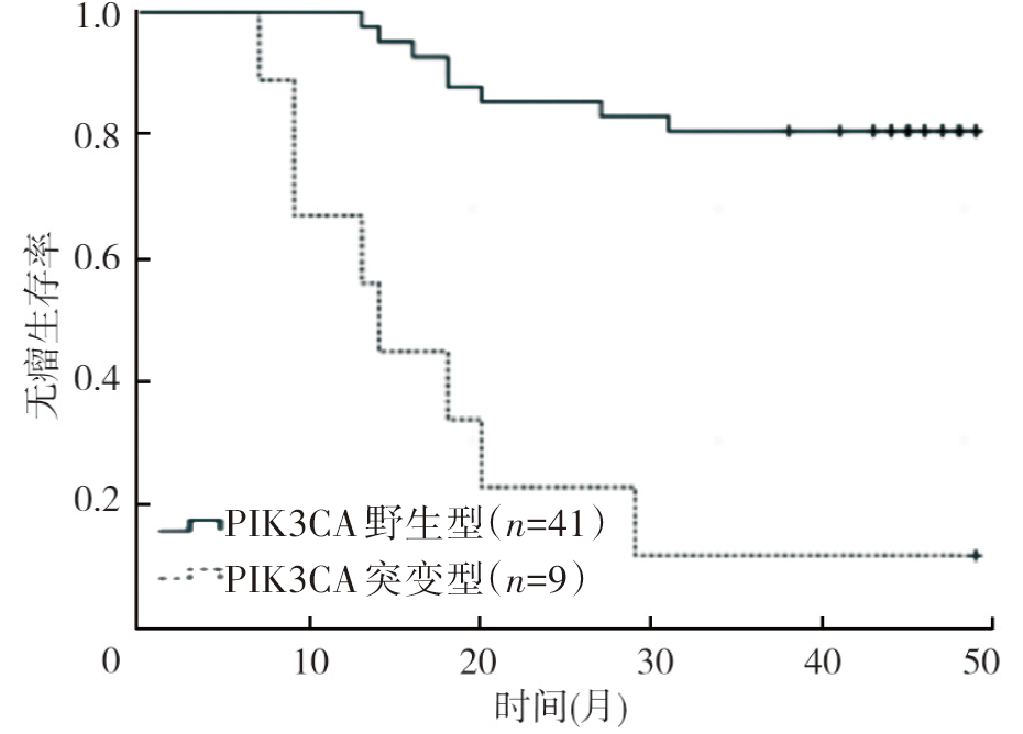目的检测三阴性乳腺癌(TNBC)组织中的PIK3CA状态,分析PIK3CA突变与临床特征的关系及对预后的影响。方法收集2016年1月1日至2018年12月31日河南省新乡市中心医院收治的原发性TNBC患者50例,检测肿瘤组织PIK3CA突变状态,分析PIK3CA突变与TNBC患者临床特征的关系及对预后的影响。结果50例TNBC患者中,检测到PIK3CA基因突变9例,突变频率18.0%;其中H1047R突变4例,E545K突变3例,E542K突变2例。PIK3CA基因突变与年龄(χ2=3.55,P=0.060)、肿瘤部位(χ2=1.01,P=0.315)、肿瘤大小(χ2<0.01,P>0.999)、淋巴结状态(χ2=0.76,P=0.385)、临床分期(χ2=0.65,P=0.420)、Ki-67值(χ2<0.01,P>0.999)、P53状态(χ2=0.02,P=0.894)以及人表皮生长因子受体-2(HER-2)状态(χ2=1.65,P=0.200)均无明显相关性。预后分析显示,PIK3CA野生型患者的3年无瘤生存率显著高于突变型患者(80.5%比11.1%,χ2=28.23,P<0.001)。结论TNBC患者的PIK3CA基因突变频率较高,TNBC患者PIK3CA突变与临床病理特征均无相关性,PIK3CA基因突变可能与TNBC不良预后显著相关。