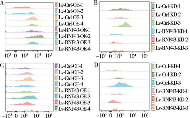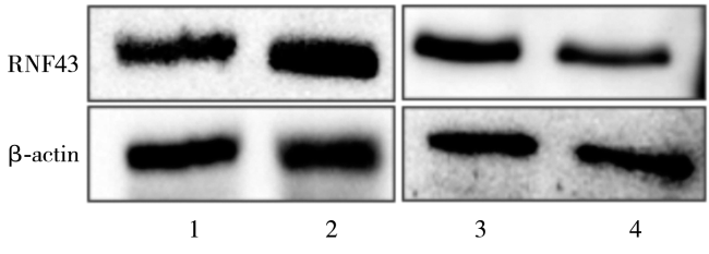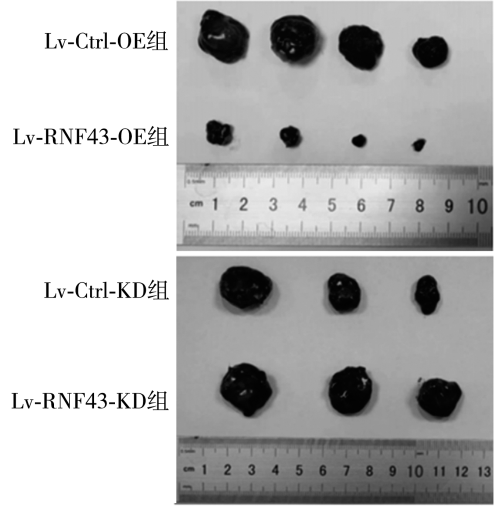 目的探讨环指蛋白43(RNF43)对黑色素瘤中CD8+T细胞介导的抗肿瘤免疫反应的调节作用。方法利用慢病毒感染技术对小鼠黑色素瘤细胞株B16-OVA进行RNF43基因过表达与敲低;通过小鼠皮下成瘤实验检测Lv-Ctrl-OE组、Lv-RNF43-OE组、Lv-Ctrl-KD组和Lv-RNF43-KD组小鼠黑色素瘤细胞株B16-OVA体内增殖情况,通过流式细胞术检测黑色素瘤肿瘤免疫微环境中CD8+T细胞穿孔素和γ干扰素(IFN-γ)的表达水平;采用实时荧光定量PCR实验检测细胞中β-catenin和程序性死亡受体配体1(PD-L1) mRNA的表达水平;通过双荧光素酶报告基因实验检测RNF43对PD-L1的转录调控作用。结果本研究成功构建RNF43稳定过表达与敲低的小鼠黑色素瘤细胞株Lv-RNF43-OE和Lv-RNF43-KD。小鼠皮下成瘤实验结果显示,Lv-RNF43-OE组瘤体质量为(0.08±0.06)g,明显小于Lv-Ctrl-OE组的(1.04±0.52)g,差异有统计学意义(t=3.71,P=0.032);Lv-RNF43-KD组瘤体质量为(1.94±0.29)g,与Lv-Ctrl-KD组的(1.15±0.74)g相比差异无统计学意义(t=-1.70,P=0.164)。流式细胞术结果显示,Lv-RNF43-OE组CD8+T细胞穿孔素荧光强度为9 034±2 628,明显高于Lv-Ctrl-OE组的3 847 ±1 637,差异有统计学意义(t=-3.35,P=0.015);Lv-RNF43-KD组CD8+T细胞穿孔素荧光强度为966±247,明显低于Lv-Ctrl-KD组的2 226±646,差异有统计学意义(t=3.16,P=0.034);Lv-RNF43-OE组CD8+T细胞IFN-γ荧光强度为2 422±429,明显高于Lv-Ctrl-OE组的1 688±324,差异有统计学意义(t=-2.73,P=0.034);Lv-RNF43-KD组CD8+T细胞IFN-γ荧光强度为614(454,863),与Lv-Ctrl-KD组的1 159(1 152,2 068)相比差异有统计学意义(Z=-1.96,P=0.050)。实时荧光定量PCR实验结果显示,Lv-RNF43-OE组β-catenin mRNA相对表达量为0.67±0.16,明显低于Lv-Ctrl-OE组的1.00±0.11,差异有统计学意义(t=2.98,P=0.041);Lv-RNF43-OE组PD-L1 mRNA相对表达量为0.32±0.09,明显低于Lv-Ctrl-OE组的1.00±0.09,差异有统计学意义(t=9.13,P=0.001)。双荧光素酶报告基因实验结果显示,pCMV6-NC组、RNF43组、RNF43+β-catenin组和β-catenin组PD-L1启动子荧光素酶活性分别为1.00±0.00、0.84±0.00、1.49±0.00和1.57±0.03(F=2 218.33,P<0.001),进一步两两比较发现,与pCMV6-NC组相比,RNF43组PD-L1启动子荧光素酶活性明显降低(P<0.001),RNF43+β-catenin组和β-catenin组PD-L1启动子荧光素酶活性明显升高(P<0.001;P=0.003);与RNF43组相比,RNF43+β-catenin组PD-L1启动子荧光素酶活性明显升高(P<0.001)。结论RNF43可能通过抑制β-catenin的表达降低黑色素瘤中PD-L1 mRNA的表达并促进CD8+T细胞介导的抗肿瘤免疫反应。