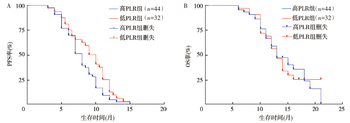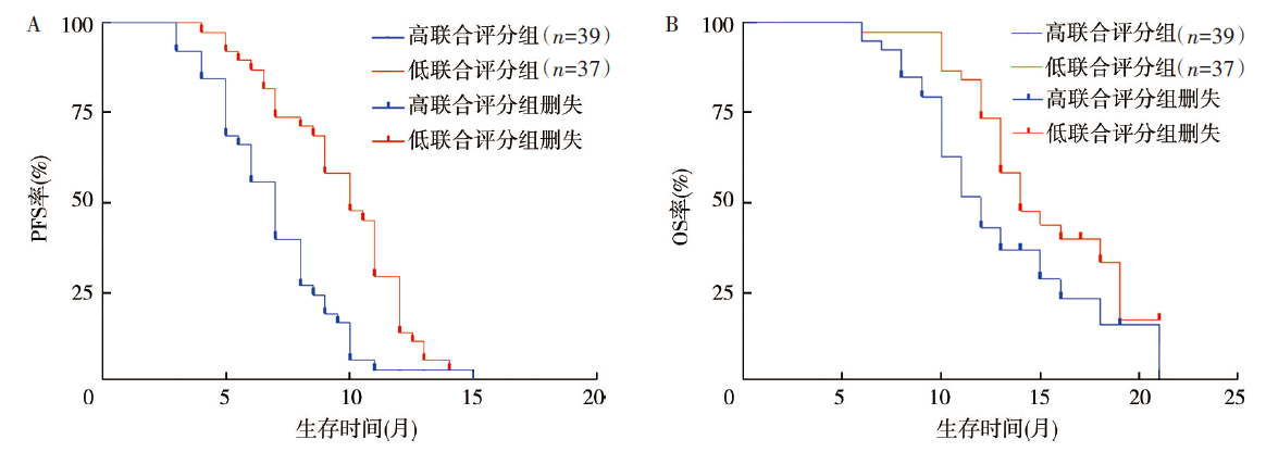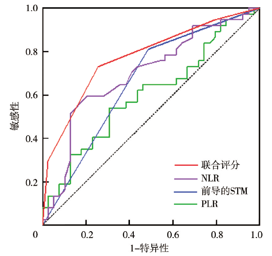 目的探讨早期血清肿瘤标志物(STM)、中性粒细胞与淋巴细胞比值(NLR)、血小板与淋巴细胞比值(PLR)联合评分对胃癌免疫治疗疗效的预测价值。方法选取2020年1月1日至2022年6月30日于百度开云体育app第二附属医院接受免疫治疗的76例胃癌患者,收集患者前导的STM、NLR、PLR,通过受试者操作特征(ROC)曲线确定NLR、PLR最佳截断值。分析不同前导的STM、NLR、PLR及联合评分接受免疫治疗胃癌患者的临床疗效及预后。采用ROC曲线评估各指标及联合评分的预测效能。采用Cox回归模型对患者生存期的影响因素进行分析。结果NLR最佳截断值为2.75,PLR最佳截断值为175.9。所有患者均至少完成了2个周期的免疫治疗,客观缓解率(ORR)为23.7%(18/76),疾病控制率(DCR)为88.2%(67/76)。高NLR组(n=43)和低NLR组(n=33)ORR[20.9%(9/43)比27.3%(9/33)]、DCR[83.7%(36/43)比93.9%(31/33)]差异均无统计学意义(χ2=0.42,P=0.519;χ2=1.02,P=0.313);高PLR组(n=44)和低PLR组(n=32)ORR[27.3%(12/44)比18.8%(6/32)]、DCR[81.8%(36/44)比96.9%(31/32)]差异均无统计学意义(χ2=0.75,P=0.388;χ2=2.71,P=0.555);高联合评分组(n=39)和低联合评分组(n=37)ORR分别为17.9%(7/39)、29.7%(11/37),差异无统计学意义(χ2=1.46,P=0.230);DCR分别为79.5%(31/39)、97.3%(36/37),差异有统计学意义(χ2=4.19,P=0.041)。76例患者中位无进展生存期(PFS)和总生存期(OS)分别为8.0、12.0个月。高NLR组和低NLR组患者中位PFS分别为7.0、10.0个月,差异有统计学意义(χ2=7.95,P=0.005);中位OS分别为12.0、14.0个月,差异无统计学意义(χ2=1.04,P=0.307)。高PLR组和低PLR组患者中位PFS分别为8.0、10.0个月,差异有统计学意义(χ2=3.90,P=0.048);中位OS分别为13.0、13.0个月,差异无统计学意义(χ2=0.02,P=0.896)。高联合评分组和低联合评分组患者中位PFS分别为7.0、10.0个月,差异有统计学意义(χ2=13.52,P<0.001);中位OS分别为12.0、14.0个月,差异有统计学意义(χ2=5.02,P=0.025)。ROC曲线分析显示,前导的STM、NLR、PLR和联合评分预测胃癌免疫治疗疗效的曲线下面积(AUC)分别为0.662、0.697、0.601、0.773。单因素分析显示,手术(HR=0.59,95%CI为0.36~0.95,P=0.031)、前导的STM(HR=0.57,95%CI为0.34~0.93,P=0.026)、NLR(HR=0.54,95%CI为0.34~0.87,P=0.011)、联合评分(HR=0.42,95%CI为0.26~0.68,P<0.001)均是接受免疫治疗胃癌患者PFS的影响因素;肿瘤分期(HR=0.30,95%CI为0.12~0.75,P=0.011)、前导的STM(HR=0.28,95%CI为0.15~0.50,P<0.001)、联合评分(HR=0.55,95%CI为0.31~0.96,P=0.036)均是接受免疫治疗胃癌患者OS的影响因素。多因素分析显示,前导的STM(HR=0.56,95%CI为0.33~0.98,P=0.041)是接受免疫治疗胃癌患者PFS的独立影响因素;肿瘤分期(HR=0.29,95%CI为0.11~0.76,P=0.012)、前导的STM(HR=0.32,95%CI为0.17~0.58,P<0.001)、联合评分(HR=0.46,95%CI为0.25~0.82,P=0.009)均是接受免疫治疗胃癌患者OS的独立影响因素。结论前导的STM、NLR、PLR的联合评分是接受免疫治疗胃癌患者OS的独立影响因素,可预测胃癌免疫治疗疗效。