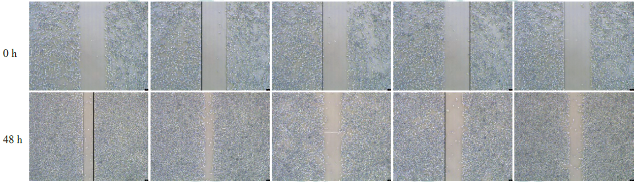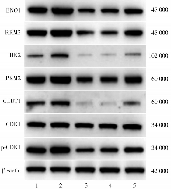 目的探究核糖核苷酸还原酶调节亚基M2(RRM2)通过调控周期蛋白依赖性激酶(CDK)1对胃癌细胞恶性生物学行为及有氧糖酵解的影响。方法将人胃癌MKN-45细胞分为si-NC组(转染空白片段)、CoCl2+si-NC组(低氧环境转染空白片段)、CoCl2+si-RRM2组(低氧环境沉默RRM2)、CoCl2+si-RRM2+pcDNA3.1 NC组(低氧环境沉默RRM2+空白载体)、CoCl2+si-RRM2+pcDNA3.1 CDK1组(低氧环境沉默RRM2+过表达CDK1)。实时荧光定量反转录PCR分析RRM2和CDK1 mRNA的相对表达量;免疫共沉淀分析RRM2和CDK1蛋白间的相互作用;MTT法检测细胞增殖活性;细胞划痕实验检测细胞迁移距离;流式细胞术检测细胞凋亡水平;三磷酸腺苷(ATP)和葡萄糖试剂盒检测ATP产生和葡萄糖消耗情况;蛋白质印迹法检测ENO1、RRM2、HK2、PKM2、GLUT1及p-CDK1/CDK1蛋白表达情况。结果实时荧光定量反转录PCR结果显示,si-NC组、CoCl2+si-NC组和CoCl2+si-RRM2组CDK1 mRNA相对表达量分别为1.01±0.15、1.30±0.06、0.51±0.18,RRM2 mRNA相对表达量分别为1.03±0.32、1.59±0.28、0.44±0.17,差异均有统计学意义(F=25.52,P=0.001;F=14.47,P=0.005);与si-NC组比较,CoCl2+si-NC组细胞RRM2和CDK1 mRNA表达均较高;与si-NC组、CoCl2+si-NC组比较,CoCl2+si-RRM2组细胞RRM2和CDK1 mRNA表达均较低(均P<0.05)。免疫共沉淀结果显示,RRM2与CDK1之间存在相互作用。MTT法、细胞划痕实验和流式细胞术结果显示,si-NC组、CoCl2+si-NC组、CoCl2+si-RRM2组、CoCl2+si-RRM2+pcDNA3.1 NC组和CoCl2+si-RRM2+pcDNA3.1 CDK1组细胞增殖活性分别为1.04±0.01、1.18±0.04、0.84±0.03、0.81±0.03、0.93±0.05,细胞迁移距离分别为(301.83±2.75)、(369.67±0.76)、(176.50±6.38)、(175.83±3.69)、(254.17±1.61)μm,细胞凋亡率分别为8.05%±0.21%、5.75%±0.20%、28.28%±0.04%、30.18%± 1.51%、17.79%±0.22%,差异均有统计学意义(F=73.82,P<0.001;F=1 600.01,P<0.001;F=787.15,P<0.001);与si-NC组和CoCl2+si-NC组比较,CoCl2+si-RRM2组、CoCl2+si-RRM2+pcDNA3.1 NC组和CoCl2+si-RRM2+pcDNA3.1 CDK1组细胞增殖、迁移能力较弱,细胞凋亡率较高(均P<0.05);与CoCl2+si-RRM2+pcDNA3.1 NC组比较,CoCl2+si-RRM2+pcDNA3.1 CDK1组细胞增殖、迁移能力较强,细胞凋亡率较低(均P<0.05)。ATP和葡萄糖检测结果显示,5组细胞ATP产生量和葡萄糖消耗量差异均有统计学意义(F=12.53,P<0.001;F=19.21,P<0.001);与si-NC组比较,CoCl2+si-RRM2+pcDNA3.1 CDK1组细胞葡萄糖消耗量较少(P<0.05);与CoCl2+si-NC组比较,CoCl2+si-RRM2+pcDNA3.1 CDK1组细胞ATP产生量和葡萄糖消耗量均较少(均P<0.05);与CoCl2+si-RRM2+pcDNA3.1 NC组比较,CoCl2+si-RRM2+pcDNA3.1 CDK1组细胞ATP产生量和葡萄糖消耗量均较多(均P<0.05)。蛋白质印迹法检测显示,5组细胞ENO1、RRM2、HK2、PKM2、GLUT1、p-CDK1/CDK1蛋白表达差异均有统计学意义(均P<0.001);与si-NC组和CoCl2+si-NC组比较,CoCl2+si-RRM2+pcDNA3.1 CDK1组细胞ENO1、RRM2、HK2、PKM2、GLUT1和p-CDK1/CDK1蛋白表达均较低(均P<0.05);与CoCl2+si-RRM2+pcDNA3.1 NC组比较,CoCl2+si-RRM2+pcDNA3.1 CDK1组细胞ENO1、RRM2、PKM2、GLUT1和p-CDK1/CDK1蛋白表达均较高(均P<0.05)。结论沉默RRM2可通过调控CDK1抑制胃癌细胞恶性生物学行为及有氧糖酵解的发生。