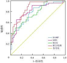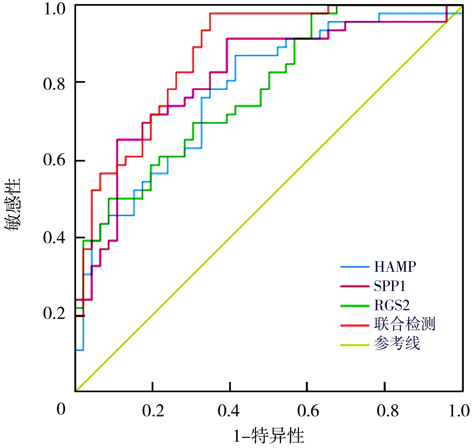 | 注:HAMP为铁调素抗菌肽;SPP1为分泌型磷蛋白1;RGS2为G蛋白信号转导调节因子2;HAMP高水平组为HAMP≥52.28 ng/ml;HAMP低水平组为HAMP<52.28 ng/ml;SPP1高水平组为SPP1≥55.96 ng/ml;SPP1低水平组为SPP1<55.96 ng/ml;RGS2高水平组为RGS2≥3.72 mg/L;RGS2低水平组为RGS2<3.72 mg/L | |||||||||||||