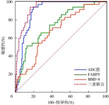 ObjectiveTo investigate the predictive value of serum matrix metalloproteinase-9 (MMP-9), fatty acid-binding protein 5 (FABP5) combined with MRI for the efficacy and recurrence of primary liver cancer after percutaneous radiofrequency ablation.MethodsA total of 192 patients with primary liver cancer who underwent percutaneous radiofrequency ablation treatment at the First Affiliated Hospital of Air Force Medical University from June 2022 to May 2023 were selected as the research subjects. MRI examination was performed within one week before the treatment, and the apparent diffusion coefficient (ADC) value was recorded. The enzyme-linked immunosorbent assay (ELISA) was used to determine the levels of MMP-9 and FABP5 in the serum. According to the results of MRI examination, the ablation status of the lesions was determined, and the patients were divided into a complete ablation group (n=157) and a residual lesion group (n=35). Patients with completely ablated lesions were regularly followed up for one year, and their recurrence status was recorded. According to the recurrence of the patients, the patients were divided into a non-recurrence group (n=115) and a recurrence group (n=42). The levels of MMP-9 and FABP5 and the ADC values of the patients in the complete ablation group and the residual lesion group, as well as those in the non-recurrence group and the recurrence group, were compared. The receiver operator characteristic (ROC) curve was used to evaluate the predictive value of serum MMP-9 and FABP5 combined with MRI for the postoperative efficacy and recurrence of the patients.ResultsThe levels of serum MMP-9 and FABP5, and the ADC value of patients in the complete ablation group were (181.05±29.68) ng/ml, (7.95±1.82) μg/L, and (1.32±0.45)×10-3mm²/s, respectively, while those in the residual lesion group were (202.18±35.06) ng/ml, (9.56±2.39) μg/L, and (0.75±0.23)×10-3mm²/s, respectively. The levels of MMP-9 and FABP5 in the complete ablation group were significantly lower than those in the residual lesion group, and the ADC value was significantly higher than that in the residual lesion group, with statistically significant differences (t=3.68,P<0.001;t=4.45,P<0.001;t=7.27,P<0.001). The areas under the curve (AUC) of serum MMP-9, FABP5, and ADC value alone in predicting the postoperative efficacy of patients were 0.68 (95%CI: 0.61-0.75), 0.75 (95%CI: 0.68-0.81), and 0.90 (95%CI: 0.85-0.94), respectively. The AUC of the combined prediction of these three was 0.94 (95%CI: 0.89-0.97), and the combined prediction of these three was superior to the individual prediction of MMP-9, FABP5, and ADC value (Z=5.72,P<0.001;Z=4.84,P<0.001;Z=2.29,P=0.022). The levels of serum MMP-9 and FABP5, and the ADC value of patients in the non-recurrence group were (176.52±30.28) ng/ml, (8.69±1.92) μg/L, and (1.35±0.29)×10-3mm²/s, respectively, while those in the recurrence group were (201.85±28.72) ng/ml, (11.05±2.86) μg/L, and (1.14±0.12)×10-3mm²/s, respectively. The levels of serum MMP-9 and FABP5 of patients in the non-recurrence group were significantly lower than those in the recurrence group, and the ADC value was significantly higher than that in the recurrence group, with statistically significant differences (t=4.70,P<0.001;t=5.93,P<0.001;t=4.55,P<0.001). The AUCs of serum MMP-9, FABP5, and ADC value alone in predicting the postoperative recurrence of patients were 0.74 (95%CI: 0.66-0.81), 0.90 (95%CI: 0.84-0.94), and 0.74 (95%CI: 0.66-0.80), respectively. The AUC of the combined prediction of these three was 0.95 (95%CI: 0.90-0.98), and the combined prediction of these three was superior to the individual prediction of MMP-9, FABP5, and ADC value (Z=5.00,P<0.001;Z=3.03,P=0.002;Z=5.33,P<0.001).ConclusionsThe levels of serum MMP-9 and FABP5 in patients with primary liver cancer treated by percutaneous radiofrequency ablation in the complete ablation group are significantly lower than those in the residual lesion group, and the ADC value is significantly higher than that in the residual lesion group. The levels of serum MMP-9 and FABP5 of patients in the non-recurrence group are also significantly lower than those in the recurrence group, and the ADC value is also significantly higher than that in the recurrence group. The combined detection of serum MMP-9, FABP5 and MRI has a relatively high clinical value in predicting the efficacy and recurrence of patients after percutaneous radiofrequency ablation for liver cancer.