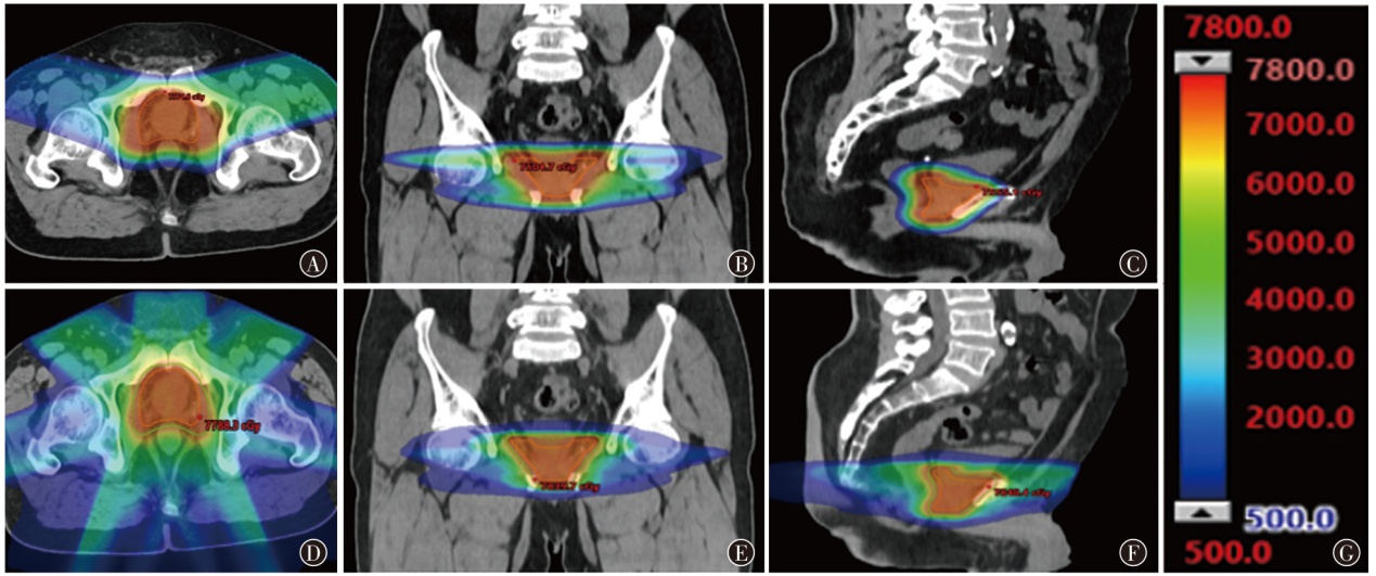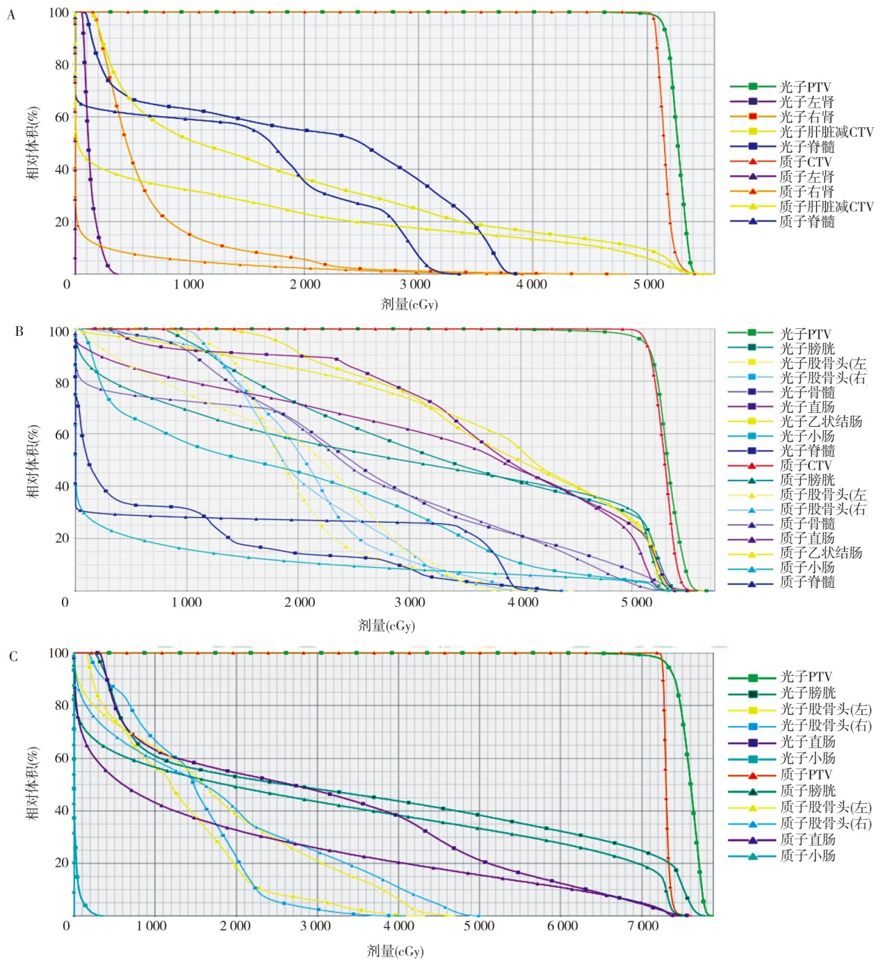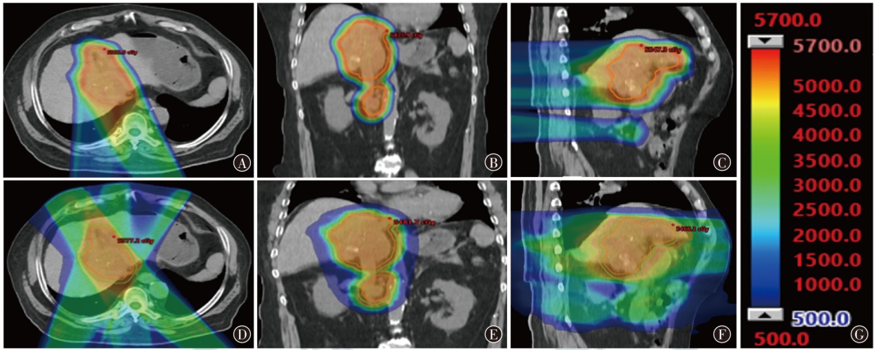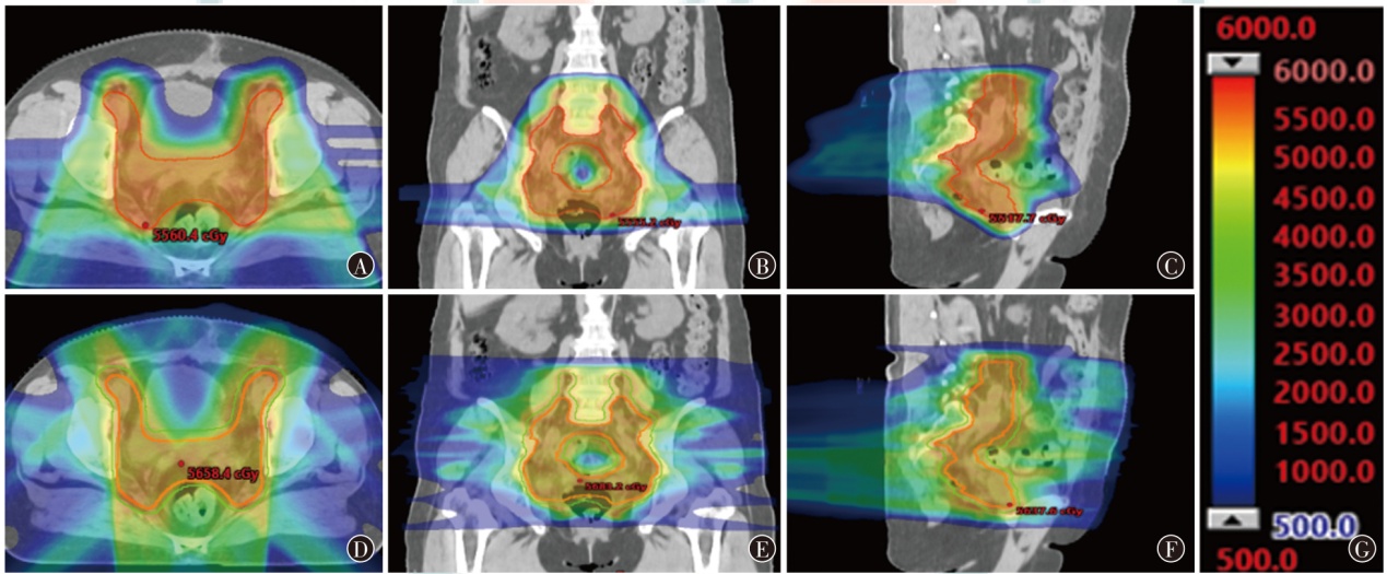 目的探讨质子调强放疗(IMPT)和光子固定野调强放疗(IMRT)应用于典型腹盆部肿瘤的剂量学特点。方法以2024年1月至6月山东省肿瘤防治研究院(山东省肿瘤医院)收治的3例腹盆部肿瘤(肝癌、宫颈癌和前列腺癌各1例)患者为研究对象,根据临床靶区和危及器官限值的要求,分别设计IMPT和IMRT两种放疗计划。评估3例患者两种放疗计划的靶区适形指数(CI)、均匀性指数(HI)和梯度指数(GI)及危及器官剂量学参数,通过评估体内10%、30%和50%处方剂量区域的体积比较患者体内额外的剂量沉积。结果3例患者IMPT计划的CI值(分别为0.61、0.62和0.43)、HI值(分别为0.053、0.075和0.020)、GI值(分别为3.45、2.63和3.80)均小于IMRT计划(CI分别为0.82、0.81和0.86;HI分别为0.060、0.120和0.080;GI分别为7.28、4.76和4.66)。与IMRT计划相比,在肝癌患者中,IMPT计划可使正常肝组织和右肾的Dmean及脊髓的Dmax分别降低37.8%、78.5%和13.2%;在宫颈癌患者中,IMPT计划可使小肠的V30,膀胱、直肠、骨髓的Dmean和脊髓的Dmax分别降低22.0%、15.7%、14.3%、12.6%和4.8%;在前列腺癌患者中,IMPT计划可使膀胱和直肠的Dmean分别降低14.9%和36.5%,但IMPT计划使左侧股骨头的Dmean及V40分别升高了35.3%和6.1%,使右侧股骨头的Dmean及V40分别升高了23.6%和10.8%。3例患者体内10%、30%和50%的处方剂量区域所占的体积,IMPT计划比IMRT计划减少了48.9%~64.8%、22.0%~47.0%、22.0%~57.7%。结论腹盆部肿瘤的IMPT和IMRT计划比较,IMPT计划在降低正常肝脏、肾脏、脊髓、小肠、直肠和膀胱等器官的剂量方面有优势;对于股骨头的剂量,IMPT计划优势并不明显;IMPT计划可显著减少患者体内额外的剂量沉积。