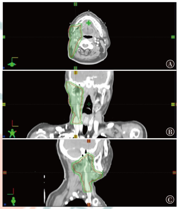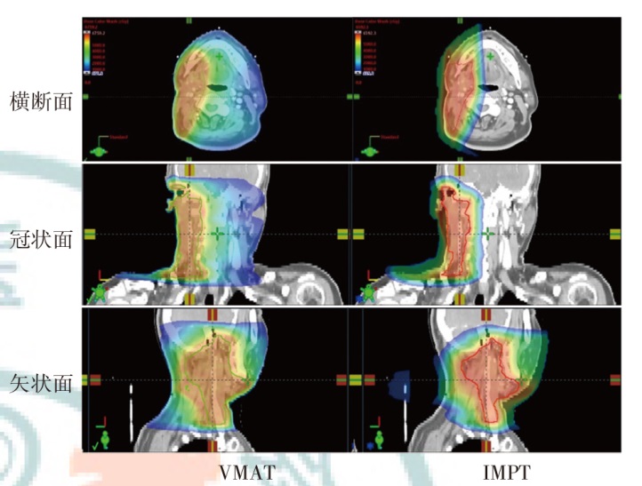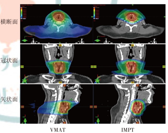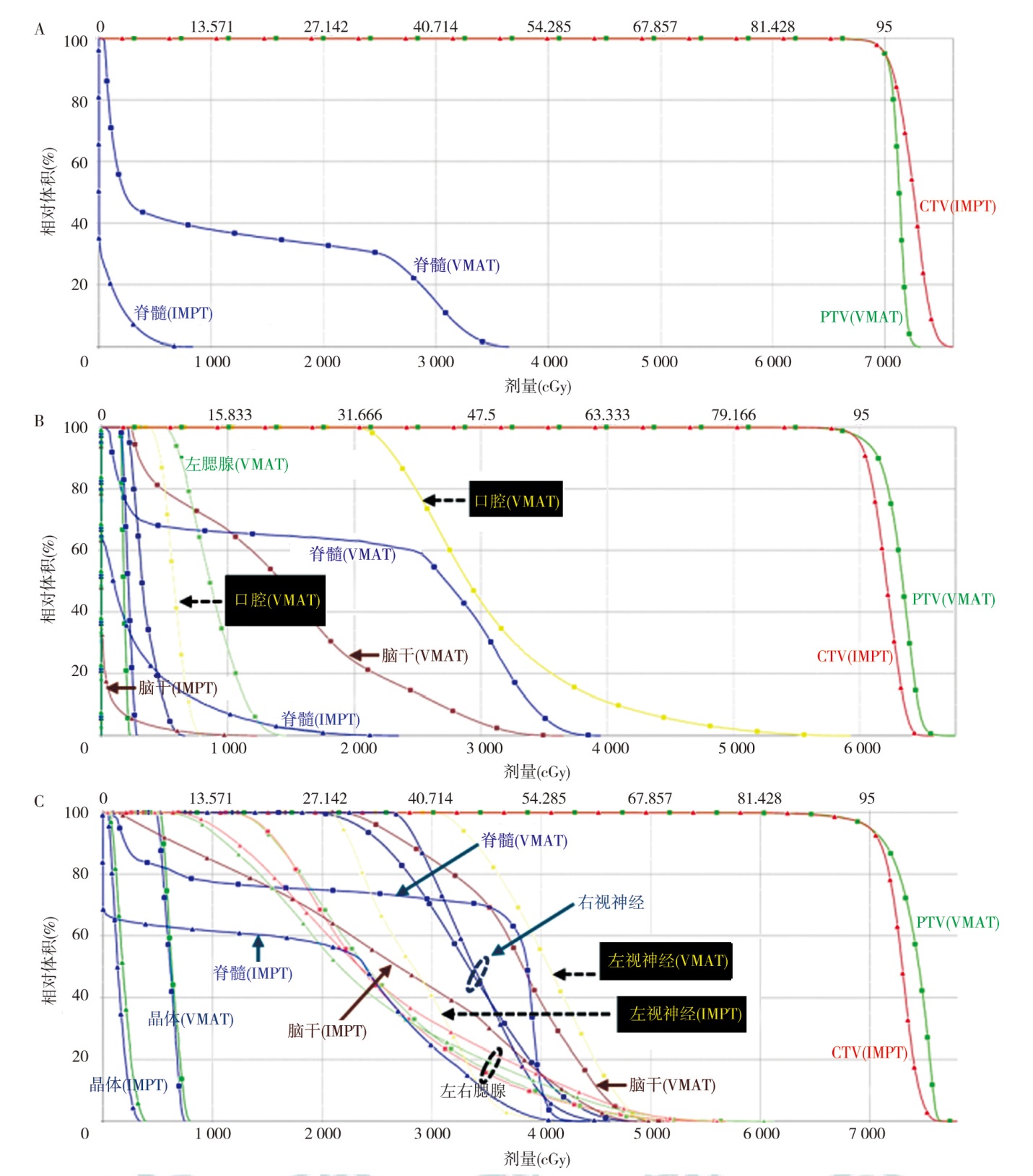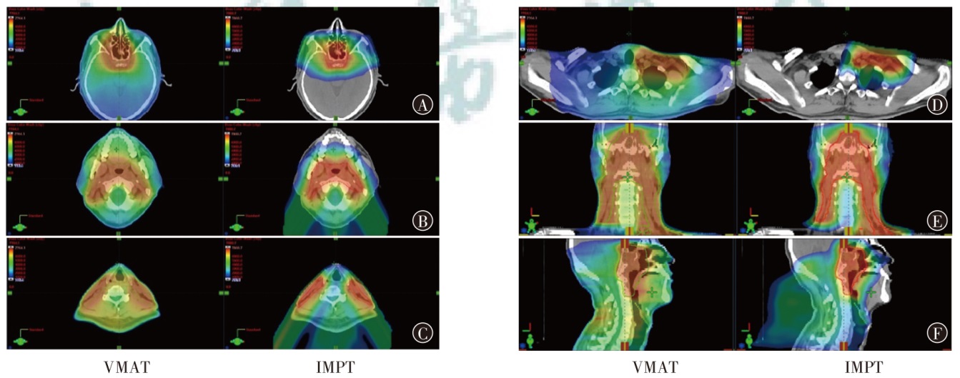 目的探索质子调强放疗(IMPT)和光子容积弧形调强放疗(VMAT)应用于典型头颈部恶性肿瘤的剂量学特点。方法以2023年12月至2024年12月山东省肿瘤防治研究院(山东省肿瘤医院)收治的鼻咽癌、腮腺癌和喉癌患者各1例为研究对象,分别根据靶区和危及器官限值的临床处方要求制定IMPT和VMAT计划。评估3例患者两种计划的靶区适形指数(CI)、均匀性指数(HI)和梯度指数(GI),并评估危及器官的剂量学指标。结果鼻咽癌、腮腺癌和喉癌患者IMPT计划的CI分别为0.70、0.72和0.67,HI分别为0.11、0.08和0.08,GI分别为3.08、2.49和3.75;VMAT计划的CI分别为0.77、0.82和0.91,HI分别为0.12、0.10和0.04,GI分别为3.67、2.63和3.45。IMPT计划的CI略低于VMAT计划,IMPT计划的HI与VMAT计划相当,鼻咽癌和腮腺癌患者IMPT计划的GI低于VMAT计划,喉癌患者IMPT计划的GI高于VMAT计划,且均在临床接受范围。IMPT计划在鼻咽癌、腮腺癌和喉癌治疗中表现出显著的剂量优势:对于鼻咽癌患者,IMPT计划的左、右晶体Dmax比VMAT分别降低了54.1%和50.4%,口腔和喉头的Dmean分别降低了40.5%和49.6%。对于腮腺癌患者,IMPT的脑干和脊髓Dmax比VMAT分别降低了66.2%和40.5%。对于喉癌患者,IMPT的脊髓Dmax比VMAT降低了77.0%,而甲状软骨Dmean比VMAT增加了8.0%。对于患者体内的额外剂量,以患者体内10%、30%和50%的处方剂量区域所占的绝对体积为例,鼻咽癌患者IMPT比VMAT计划分别降低了29.7%、29.6%和34.9%,腮腺癌患者IMPT比VMAT计划分别降低了61.0%、39.7%和17.4%,喉癌患者IMPT比VMAT计划分别降低了63.9%、31.7%和4.1%。结论相比VMAT计划,IMPT计划可有效降低头颈部肿瘤靶区附近大部分危及器官的受照射剂量,但对于紧邻靶区的串型器官,其剂量可能更高,需要引起关注。