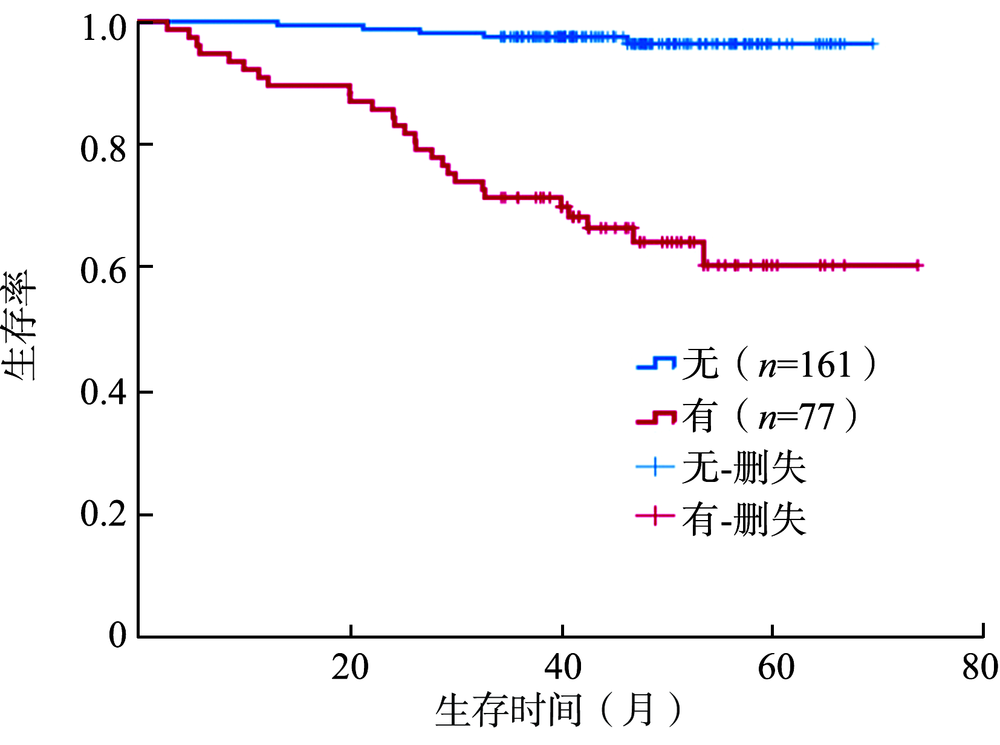 目的探讨肾透明细胞癌(ccRCC)患者术前CT征象影响总生存期的独立危险因素并绘制列线图。方法回顾性分析空军军医大学第一附属医院2011年10月至2015年12月术前行CT扫描并最终经病理学证实的ccRCC患者238例。由两名影像科医生对每例患者的CT征象进行评价,并收集患者的一般资料、肾功能检查以及世界卫生组织/国际泌尿病理协会(WHO/ISUP)分级。绘制Kaplan-Meier生存曲线,采用log-rank检验比较生存率。采用Cox比例风险回归进行单变量和多变量分析,并根据多变量分析结果绘制列线图,采用Bootstrap 1000法内部验证后计算C-指数。结果238例患者 经3~74个月随访后,死亡组32例,截尾组206例。死亡组患者的肿瘤直径为(65.70±27.29)mm,大于截尾组的(46.25±26.16)mm,差异有统计学意义(t=-3.889,P<0.001)。死亡组患者肿瘤坏死(χ2=45.716,P<0.001)、区域淋巴结肿大(χ2=43.342,P<0.001)、肾周脂肪侵犯(χ2=19.324,P<0.001)的发生率均高于截尾组患者。不同肿瘤直径的ccRCC患者其生存率差异有统计学意义(χ2=17.108,P<0.001)。肿瘤组织出现坏死患者的生存率较无坏死患者低(χ2=48.195,P<0.001);区域淋巴结肿大患者的生存率低于无区域淋巴结肿大的患者(χ2=47.232,P<0.001);出现肾周脂肪侵犯患者的生存率低于未侵犯的患者(χ2=19.964,P<0.001)。不同WHO/ISUP分级ccRCC患者的生存率差异有统计学意义(χ2=27.765,P<0.001)。多变量Cox比例风险回归分析结果显示,CT征象中的肿瘤直径(HR=2.90,95%CI为1.37~6.14,P=0.006)、坏死(HR=8.88,95%CI为3.33~23.69,P<0.001)及区域淋巴结肿大(HR=4.48,95%CI为2.04~9.86,P<0.001)是ccRCC患者死亡的独立危险因素。列线图的C-指数为0.870。结论术前CT征象与ccRCC患者的生存率存在相关性,其中肿瘤直径、肿瘤出现坏死以及区域淋巴结肿大是其死亡的独立危险因素,其列线图具有较高的准确性。