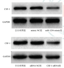 目的探讨miR-1254及其靶基因巨噬细胞集落剌激因子-1(CSF-1)在胶质瘤组织、胶质瘤细胞中的表达,以及miR-1254和CSF-1对胶质瘤细胞增殖和侵袭能力的影响。方法收集2017年4月至2019年5月在湖北省十堰市太和医院接受手术治疗的30例胶质瘤患者的临床病理标本以及癌旁组织,采用实时荧光定量PCR(qRT-PCR)检测胶质瘤组织、癌旁组织以及细胞株U87和人脑正常胶质细胞HEB中miR-1254和CSF-1 mRNA的表达水平。将胶质瘤U87细胞分为空白对照组、mimic NC组、miR-1254 mimic组以及siRNA NC组、CSF-1 siRNA组。采用qRT-PCR检测各组细胞miR-1254及CSF-1的mRNA表达水平;采用Western blotting检测各组细胞CSF-1的蛋白表达水平;采用双荧光素酶报告基因实验验证miR-1254和CSF-1基因的靶向关系;采用CCK-8法和Transwell侵袭实验检测细胞的增殖和侵袭能力。结果胶质瘤组织中miR-1254 mRNA的相对表达量为0.44±0.16,癌旁组织为1.15±0.28,差异具有统计学意义(t=12.914,P<0.001);胶质瘤组织中CSF-1 mRNA的相对表达量为1.96±0.27,癌旁组织为0.98±0.22,差异具有统计学意义(t=14.970,P<0.001)。胶质瘤细胞U87中miR-1254 mRNA的相对表达量为0.39±0.11,人脑正常胶质细胞HEB中为1.03±0.02,差异具有统计学意义(t=10.113,P=0.008);胶质瘤细胞U87中CSF-1 mRNA相对表达量为1.02±0.03,人脑正常胶质细胞HEB为0.32±0.13,差异具有统计学意义(t=9.037,P=0.009)。转染miR-1254后,CSF-1 mRNA、蛋白的表达水平均随miR-1254表达水平的升高而降低。双荧光素酶报告基因实验结果显示,与mimic NC组(1.04±0.12)比较,miR-1254 mimic组(0.31±0.02)CSF-1-WT细胞中荧光活性显著降低(t=10.430,P<0.001)。转染48 h后,空白对照组(0.71±0.01)、mimic NC组(0.68±0.04)、miR-1254 mimic组(0.35±0.01)细胞增殖能力差异具有统计学意义(F=252.651,P<0.001);miR-1254 mimic组与空白对照组相比,差异具有统计学意义(P<0.001);miR-1254 mimic组与mimic NC组相比,差异具有统计学意义(P<0.001)。空白对照组(0.71±0.01)、siRNA NC组(0.68±0.04)、CSF-1 siRNA组(0.25±0.01)细胞增殖能力差异具有统计学意义(F=320.309,P<0.001);CSF-1 siRNA组与空白对照组相比,差异具有统计学意义(P<0.001);CSF-1 siRNA组与siRNA NC组相比,差异具有统计学意义(P<0.001)。侵袭实验结果显示空白对照组(365±27)、mimic NC组(388±24)、miR-1254 mimic组(83±15)细胞穿膜数差异具有统计学意义(F=173.915,P<0.001);空白对照组(365±27)、siRNA NC组(404±32)、CSF-1 siRNA组(87±14)细胞穿膜数差异具有统计学意义(F=141.294,P<0.001)。结论miR-1254在胶质瘤组织和胶质瘤细胞株U87中的表达均显著下降,CSF-1在胶质瘤组织和胶质瘤细胞株U87中的表达均显著升高。过表达miR-1254可能通过靶向降低CSF-1的表达来抑制胶质瘤U87细胞的增殖和侵袭能力。