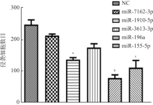 目的筛选肝癌干细胞来源外泌体中差异表达的miRNA并分析其对肝癌细胞恶性生物学特征的影响。方法采用miRNA表达谱芯片分析肝癌干细胞来源外泌体中差异表达的miRNA并鉴定miRNA对肝癌干细胞恶性表型的作用。采用不同浓度(0、150、300 μmol/L)多柔比星处理细胞,采用实时定量PCR(qRT-PCR)检测miR-196a表达水平的变化;分别采用肝癌干细胞来源外泌体(Exo-NC组)、转染miR-196a抑制剂处理后的外泌体(Exo-Inhibitor组)培养肝癌细胞,检测肝癌细胞的凋亡情况以及caspase3/7的活性。按照随机数字表法将裸鼠分为Do-PBS组、Do-Exo-Inhibitor组、Do-Exo-NC组,每组各5只,采用裸鼠移植瘤实验分析miR-196a对肝癌细胞裸鼠移植瘤模型的作用。结果本研究分离纯化了CD133+Huh7干细胞培养上清中的外泌体,发现miR-7162-3p、miR-1910-5p、miR-3613-3p、miR-196a、miR-155-5p表达上调,miR-1246和miR-3613-5p表达下调。外泌体中miR-7162-3p、miR-196a和miR-155-5p对肝癌干细胞的自我更新能力具有重要影响;miR-1910-5p、miR-196a和miR-155-5p对肝癌干细胞的侵袭能力具有重要影响,其中miR-196a的抑制效果最显著。在反应24 h时,多柔比星浓度在0、150、300 μmol/L时miR-196a的表达量分别为0.96±0.05、1.23±0.05和2.33±0.03,差异具有统计学意义(F=996.90,P<0.001);48 h时,多柔比星浓度在0、150、300 μmol/L时miR-196a的表达量分别为1.02±0.07、2.35±0.05和2.89±0.55,差异具有统计学意义(F=303.00,P<0.001)。Exo-NC组肝癌细胞在多柔比星浓度为0和300 μmol/L时的细胞凋亡率分别为9.37%±0.19%和11.64%±0.27%,Exo-Inhibitor组分别为18.80%±1.91%和22.79%±1.57%,差异均具有统计学意义(t=4.41,P=0.048;t=4.96,P=0.038)。未使用多柔比星处理时,Exo-NC组在24 h和48 h的caspase3/7比值分别为0.94±0.08和0.97±0.09,Exo-Inhibitor组分别为1.56±0.01和1.58±0.01,差异均具有统计学意义(t=11.41,P=0.008;t=6.07,P=0.026)。使用300 μmol/L多柔比星处理细胞后,Exo-NC组在24 h和48 h的caspase3/7比值分别为0.95±0.07、1.36±0.08,Exo-Inhibitor组分别为2.84±0.08、3.20±0.14,差异均具有统计学意义(t=24.20,P=0.002;t=15.78,P=0.004)。Do-PBS组、Do-Exo-Inhibitor组和Do-Exo-NC组3组裸鼠的移植瘤体积依次增大,分别为(1 051.86±89.90)mm3、(1 310.91±86.66)mm3和(2 185.14±352.34)mm3,差异具有统计学意义(F=30.28,P<0.001);3组移植瘤重量依次增加,分别为(0.36±0.10)g、(0.39±0.12)g和(0.76±0.16)g,差异具有统计学意义(F=11.81,P=0.002);转染miR-196a抑制剂后裸鼠移植瘤肿瘤内miR-196a的表达显著降低,3组表达量分别为1.05±0.16、0.38±0.08和2.17±0.26,差异具有统计学意义(F=48.93,P<0.001)。结论肝癌干细胞分泌的外泌体可通过其中的miR-196a增强肝癌细胞对多柔比星的耐药性。
