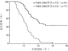 目的 探索营养风险筛查-2002(NRS-2002)对胸段食管鳞状细胞癌术后淋巴结转移放化疗患者疗效及预后的预测价值。方法 对2013年1月至2016年12月间在蚌埠医学院附属泰兴人民医院肿瘤放疗科接受放化疗的140例胸段食管鳞状细胞癌术后伴有淋巴结转移患者进行回顾性分析,根据治疗前血红蛋白的中位值将患者分为血红蛋白<127 g/L组(n=65)及血红蛋白≥127 g/L组(n=75);参照NRS-2002工具标准,进行营养风险评分,并根据最佳临界值将患者分为NRS-2002<3分组(n=65)和NRS-2002≥3分组(n=75)。采用logistic回归分析影响近期疗效的相关因素;采用Kaplan-Meier法计算生存率并行log-rank检验,采用Cox回归模型进行生存预后单因素及多因素分析。绘制受试者工作特征(ROC)曲线,计算曲线下面积评估NRS-2002预测疗效及生存预后的准确性。结果 全组患者总体治疗有效率为65.0%(91/140),其中,血红蛋白<127 g/L组及血红蛋白≥127 g/L组患者的治疗有效率分别52.3%(34/65)和76.0%(57/75),差异有统计学意义(χ2=8.592,P=0.003);NRS-2002<3分组和NRS-2002≥3分组患者的治疗有效率分别为81.5%(53/65)、50.7%(38/75),差异有统计学意义(χ2=14.588,P<0.001)。单因素logistic回归分析显示,治疗方式(HR=1.322,95%CI为1.121~3.632,P=0.012)、血红蛋白(HR=0.346,95%CI为0.169~0.711,P=0.004)和NRS-2002评分(HR=3.374,95%CI为1.185~9.611,P<0.001)与近期疗效密切相关;多因素logistic回归分析显示,治疗方式(HR=1.125,95%CI为1.098~2.927,P=0.042)与NRS-2002评分(HR=3.868,95%CI为1.723~8.685,P<0.001)是近期疗效的独立影响因素。所有入组患者中位总生存期(OS)为16.0个月(95%CI为14.3~17.7),1、2、3年生存率分别为69.3%、28.6%和21.4%。其中,血红蛋白<127 g/L组患者的1、2、3年生存率分别为62.1%、21.5%和10.8%,血红蛋白≥127 g/L组患者的1、2、3年生存率分别为74.7%、34.7%和30.7%,差异有统计学意义(χ2=7.370,P=0.007);NRS-2002评分<3分组患者的1、2、3年生存率分别为89.2%、50.8%和43.1%,NRS-2002评分≥3分组患者的1、2、3年生存率分别为52.0%、9.3%和2.7%,差异有统计学意义(χ2=48.778,P<0.001)。Cox单因素分析显示,治疗方式(HR=1.375,95%CI为1.108~1.968,P=0.019)、血红蛋白(HR=0.607,95%CI为0.417~0.885,P=0.009)和NRS-2002评分(HR=0.471,95%CI为0.349~0.636,P<0.001)均与胸段食管鳞状细胞癌术后淋巴结转移患者的OS密切相关,Cox多因素分析结果显示,仅NRS-2002评分(HR=0.494,95%CI为0.365~0.669,P<0.001)是影响OS的独立预后因素。ROC曲线显示,NRS-2002评分预测近期疗效和OS的曲线下面积分别为0.669(95%CI为0.576~0.762,P=0.001)和0.798(95%CI为0.719~0.878,P<0.001)。结论 治疗前NRS-2002评分<3分的胸段食管鳞状细胞癌术后淋巴结转移放化疗患者具有较好的近期疗效及远期生存。