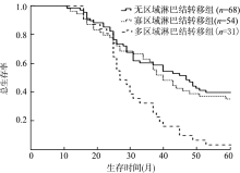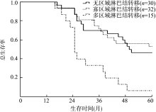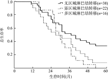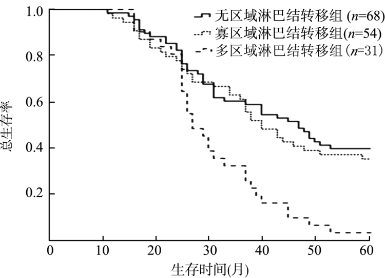 目的 探索胸段食管鳞状细胞癌根治术术后病理淋巴结转移区域数目对患者预后的影响。方法 回顾性分析2012年1月至2014年12月在扬州大学附属泰兴人民医院胸外科接受食管癌根治术的153例患者的临床病理资料,其中76例患者术后无辅助治疗、77例患者术后接受辅助放疗或放化疗,根据美国胸科协会淋巴结分组标准和患者术后病理淋巴结转移区域数目将患者分为无区域淋巴结转移组(n=68)、寡区域淋巴结转移组(1~2个淋巴结区域转移,n=54)和多区域淋巴结转移组(≥3个淋巴结区域转移,n=31)。采用Kaplan-Meier法估算生存率并进行log-rank检验,Cox比例风险模型分析预后因素,受试者工作特征(ROC)曲线分析淋巴结转移区域数目对患者预后的预测价值。结果 153例患者中位总生存期(OS)为37.0个月,1、3、5年OS率分别为97.4%、51.0%和30.7%。无区域淋巴结转移组患者中位OS为46.0个月,1、3、5年OS率分别为97.1%、58.8%、39.7%;寡区域淋巴结转移组患者中位OS为39.0个月,1、3、5年OS率分别为94.4%、55.6%、35.2%;多区域淋巴结转移组患者中位OS为26.0个月,1、3、5年OS率分别为98.1%、25.8%、3.2%,3组差异具有统计学意义(χ2=18.257,P<0.001)。在76例术后无辅助治疗的患者中,无区域淋巴结转移患者的1、3、5年OS率分别为94.7%、50.0%、34.2%,寡区域淋巴结转移患者分别为90.9%、36.4%、9.1%,多区域淋巴结转移患者分别为97.4%、18.8%、0,差异具有统计学意义(χ2=8.201,P=0.017)。在77例术后辅助治疗的患者中,无区域淋巴结转移患者的1、3、5年OS率分别为97.7%、66.7%、46.7%,寡区域淋巴结转移患者分别为96.9%、68.8%、53.1%,多区域淋巴结转移患者分别为93.3%、26.7%、6.7%,差异具有统计学意义(χ2=18.083,P<0.001)。单因素分析显示,年龄(HR=1.534,95%CI为1.041~2.260,P=0.030)、T分期(HR=1.757,95%CI为1.197~2.579,P=0.004)、N分期(HR=1.548,95%CI为1.043~2.297,P=0.030)、TNM分期(HR=1.392,95%CI为1.114~2.459,P=0.015)、辅助治疗(HR=0.545,95%CI为0.370~0.803,P=0.002)、淋巴结转移区域数目(多区域淋巴结转移与无区域淋巴结转移相比:HR=0.385,95%CI为0.238~0.624,P<0.001;多区域淋巴结转移与寡区域淋巴结转移相比:HR=0.442,95%CI为0.269~0.726,P=0.001)均与食管鳞状细胞癌术后患者的OS密切相关;多因素分析显示,T分期(HR=1.699,95%CI为1.143~2.525,P=0.009)、辅助治疗(HR=0.577,95%CI为0.386~0.864,P=0.008)、淋巴结转移区域数目(多区域淋巴结转移与无区域淋巴结转移相比:HR=0.553,95%CI为0.411~0.996,P=0.011;多区域淋巴结转移与寡区域淋巴结转移相比:HR=0.550,95%CI为0.328~0.924,P=0.024)是OS的独立预后因素。ROC曲线分析显示淋巴结转移区域数目(AUC为0.648,95%CI为0.560~0.735,P=0.004)在预测食管鳞状细胞癌根治术患者的OS方面优于淋巴结转移数目(AUC为0.595,95%CI为0.497~0.694,P=0.061)。结论 胸段食管鳞状细胞癌术后病理淋巴结转移区域数目在预测生存预后方面具有重要价值,而辅助治疗能显著提高寡区域淋巴结转移患者的OS。