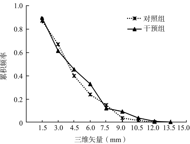 目的 研究头颈部肿瘤旋转误差对放疗位置精准性(PA)的影响,评价是否需要矫正旋转误差。方法 收集2019年8月至2020年1月武汉大学中南医院肿瘤放疗中心34例头颈部肿瘤患者的图像资料。每例患者放疗前拍摄兆伏级计算机断层扫描(MVCT)图像,采用两种配准方式与计划千伏级计算机断层扫描(KVCT)图像配准,根据不同配准方式分为对照组(平移配准)和干预组(平移和旋转配准),两组各有144次图像配准。记录两种配准方式的位置误差并比较。数据处理采用Wilcoxon符号秩检验和Spearman秩相关分析。结果 对照组和干预组左右方向平移误差分别为0.10(5.35)mm和0.00(5.78)mm,差异有统计学意义(Z=-2.675,P=0.007);上下方向分别为0.75(2.78)mm和0.60(2.68)mm,差异有统计学意义(Z=-2.819,P=0.005);前后方向分别为0.10(0.90)mm和0.20(1.28)mm,差异有统计学意义(Z=-3.984,P<0.001)。干预组俯仰角(pitch)、翻滚角(roll)、偏航角(yaw)旋转误差分别为-0.20(0.60)°、0.35(2.00)°和0.00(0.98)°。两组三维矢量矫正频数呈正偏态分布。矫正累积频率(CCF)随三维矢量不同而变化,三维矢量为8.0 mm,对照组和干预组分别有19次和16次分次治疗未矫正;三维矢量在8.0~13.5 mm之间,干预组矫正趋势减缓且延迟矫正全部分次治疗。Spearman秩相关分析显示,pitch旋转误差与对照组上下方向和干预组前后方向平移误差均呈负相关(r=-0.182,P=0.029和r=-0.484,P<0.001);roll旋转误差与干预组左右方向平移误差呈负相关(r=-0.334,P<0.001);yaw旋转误差与对照组上下方向平移误差呈负相关(r=-0.171,P=0.040),yaw旋转误差与干预组左右和上下方向平移误差分别呈正相关(r=0.370,P<0.001)和负相关(r=-0.203,P=0.015);总角度与对照组上下、前后方向平移误差和三维矢量分别呈正相关(r=0.246,P=0.003)、负相关(r=-0.188,P=0.024)和正相关(r=0.198,P=0.017),总角度与干预组上下方向平移误差和三维矢量均呈正相关(r=0.170,P=0.041;r=0.239,P=0.004);其余变量间均无相关性(均P>0.05)。结论 尽管矫正旋转增加前后方向平移误差和三维矢量,但可促进头颈部肿瘤放疗PA。旋转矫正受限可通过矫正平移误差补偿,以降低其对PA的影响。