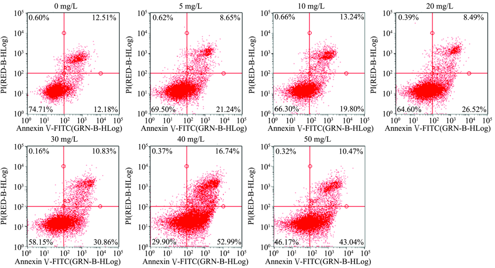 目的探讨核心蛋白聚糖(DCN)对膀胱癌细胞增殖、迁移及其侵袭的影响。方法以膀胱癌T24细胞株为研究对象,利用MTT法检测24、48、72、96 h不同浓度(0、5、10、20、30、40、50 mg/L)DCN对T24细胞增殖的抑制作用,流式细胞仪分析DCN对T24细胞周期及凋亡的影响,MTT法、Transwell细胞迁移和细胞侵袭实验分别检测DCN对T24细胞的黏附、迁移及侵袭的影响,ELISA及蛋白质印迹法分别检测DCN对TGF-β1和P21蛋白表达的影响。结果用浓度为0、5、10、20、30、40、50 mg/L DCN处理T24细胞,在24、48、72、96 h时细胞增殖活力差异均具有统计学意义(F=168.64,P<0.001;F=165.81,P<0.001;F=291.02,P<0.001;F=148.93,P<0.001);用0、5、10、20、30、40和50 mg/L浓度的DCN处理T24细胞72 h时,细胞增殖活力分别为(60.71±3.03)%、(40.82±2.09)%、(37.24±1.63)%、(25.65±2.55)%、(23.00±2.67)%、(10.78±1.17)%、(11.04±0.96)%,差异具有统计学意义,40 mg/L浓度时增殖活力达到最低水平,对细胞增殖的抑制作用最强。40、50 mg/L浓度时G1期细胞达到高峰值,S期达最低,整个处理过程G2期始终保持不变。0、5、10、20、30、40、50 mg/L浓度DCN作用72 h时的细胞凋亡率分别为(12.18±1.17)%、(21.24±1.05)%、(19.80±1.20)%、(26.52±1.40)%、(30.86±1.40)%、(52.99±1.22)%、(43.04±2.16)%,差异具有统计学意义(F=178.54,P<0.001);5、10、20、30、40、50 mg/L浓度DCN凋亡率与0 mg/L浓度DCN相比,差异均具有统计学意义(均P<0.001)。DCN作用于T24细胞72 h时,0、40 mg/L浓度时的细胞黏附率分别为(37.14±1.35)%、(59.86±1.95)%,差异具有统计学意义(t=25.25,P<0.001);迁移细胞数分别为53.86±3.18、12.86±1.35,差异具有统计学意义(t=31.36,P<0.001)。DCN作用于T24细胞48 h时,0、40 mg/L浓度时的侵袭数分别为235.14±3.44、160.86±3.13,差异具有统计学意义(t=2.27,P<0.001)。当T24细胞被DCN处理72 h 后,0、5、10、20、30、40、50 mg/L浓度时的TGF-β1相对表达量分别为85.67±3.35、45.51±1.19、49.93±4.15、47.64±3.53、46.05±3.18、25.54±2.25、33.44±4.05,差异具有统计学意义(F=324.58,P<0.001),与0 mg/L相比,5、10、20、30、40、50 mg/L浓度均对TGF-β1的表达有明显的抑制作用(均P<0.001);与0 mg/L浓度相比,P21蛋白经40 mg/L DCN处理72 h后上调。结论DCN在体外能够抑制T24细胞增殖,诱导其凋亡,并具有抗T24细胞转移的作用。