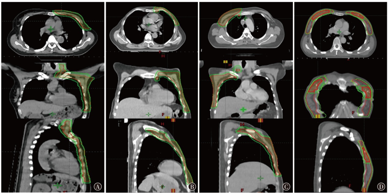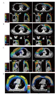 | 3 | 右侧 | 48 | 右侧胸壁加右侧内乳、锁骨上下淋巴引流区 | IMRT:50 Gy/25 f;IMPT:50 Gy(RBE)/25 f |