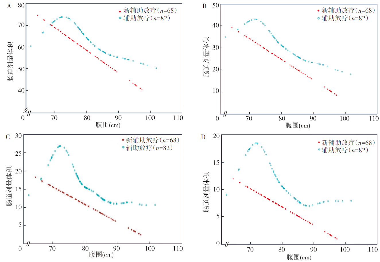 目的探究直肠癌盆腔调强放疗中腹围对肠道受照剂量体积及急性肠道毒性的影响。方法收集2023年3月至2025年1月在贵州医科大学附属肿瘤医院接受辅助和新辅助同步放化疗治疗的150例局部进展期直肠癌(LARC)患者,其中辅助放疗82例,新辅助放疗68例。所有患者均按俯卧位垫腹板并膀胱充盈的标准模式进行放疗CT模拟定位。根据是否发生≥2级急性肠道毒性将肠道毒性处理为二分类变量。采用线性及logistic回归模型分析LARC患者各个肠道受照剂量体积(V10、V20、V30、V40)、急性肠道毒性的影响因素,采用广义相加模型和分段线性及logistic回归分析腹围与肠道受照剂量体积和急性肠道毒性的阈值效应。根据阈值95%CI上限确定腹围界值,利用差异性检验验证小腹围和中大腹围在肠道受照剂量体积和急性肠道毒性的差异。结果单因素分析显示,性别、体质量、腹围、计划靶区(PTV)、肠道体积均是辅助放疗LARC患者各个肠道受照剂量体积(V10、V20、V30、V40)的影响因素(均P<0.05),体质量、腹围、肠道体积均是新辅助放疗LARC患者各个肠道受照剂量体积(V10、V20、V30、V40)的影响因素(均P<0.05),体质量指数(BMI)、腹围、肠道体积、各个肠道受照体积(V10、V20、V30、V40)均是辅助放疗LARC患者急性肠道毒性的影响因素(均P<0.05),体质量、BMI、腹围、多个肠道受照剂量体积(V20、V30、V40)均是新辅助放疗LARC患者急性肠道毒性的影响因素(均P<0.05)。多因素分析显示,腹围(V10:β=-1.01,95%CI为-1.68~-0.33,P=0.004;V20:β=-0.94,95%CI为-1.28~-0.60,P<0.001;V30:β=-0.58,95%CI为-0.82~-0.34,P<0.001;V40:β=-0.41,95%CI为-0.60~-0.23,P<0.001)是辅助放疗LARC患者各个肠道受照剂量体积的独立影响因素,腹围(V10:β=-0.92,95%CI为-1.62~-0.22,P=0.010;V20:β=-0.84,95%CI为-1.11~-0.57,P<0.001;V30:β=-0.42,95%CI为-0.57~-0.28,P<0.001;V40:β=-0.30,95%CI为-0.41~-0.19,P<0.001)是新辅助放疗LARC患者各个肠道受照剂量体积的独立影响因素,腹围(OR=0.86,95%CI为0.78~0.95,P=0.002)是辅助放疗LARC患者急性肠道毒性的独立影响因素,腹围(OR=0.87,95%CI为0.79~0.96,P=0.004)是新辅助放疗LARC患者急性肠道毒性的独立影响因素。广义相加模型发现腹围与辅助放疗患者肠道受照剂量体积和急性肠道毒性存在非线性关系。进一步分段回归分析结果显示,腹围与肠道受照剂量体积(V10、V20、V30、V40)和急性肠道毒性间存在阈值效应,腹围与辅助放疗LARC患者肠道受照剂量体积V10、V20、V30、V40间的拐点值均为71.9 cm;腹围与新辅助放疗LARC患者肠道受照剂量体积V10、V20、V30、V40间的拐点值分别为69.0、69.0、69.0、68.6 cm;腹围与辅助放疗、新辅助放疗LARC患者急性肠道毒性的拐点值分别为71.9、69.0 cm。根据阈值95%CI上限将辅助和新辅助放疗患者的小腹围与中大腹围界值分别设定为76.1 cm和71.9 cm。在辅助放疗患者中,小腹围患者(n=22)不同水平肠道受照剂量体积V10[(7.65±2.29)cm3比(5.88±2.68)cm3,t=2.76,P=0.007]、V20[(4.28±1.27)cm3比(2.72±1.31)cm3,t=4.81,P<0.001]、V30[(2.42±1.07)cm3比(1.37±0.76)cm3,t=4.95,P<0.001]、V40[(1.69±0.74)cm3比(0.92±0.58)cm3,t=4.93,P<0.001]均显著高于中大腹围患者(n=60);在新辅助放疗患者中,小腹围患者(n=11)V20[(3.09±0.84)cm3比(2.28±1.17)cm3,t=2.17,P=0.033]、V30[1.44(1.22,1.53)cm3比0.91(0.56,1.22)cm3,Z=-3.04,P=0.002]、V40[0.93(0.84,1.09)cm3比0.44(0.30,0.81)cm3,Z=-3.19,P=0.001]均显著高于中大腹围患者(n=57)。在辅助放疗及新辅助放疗患者中,小腹围患者与中大腹围患者急性肠道毒性差异均有统计学意义(χ2=10.46,P=0.001;χ2=8.13,P=0.004)。结论在标准模式下(俯卧位垫腹板并充盈膀胱),腹围是直肠癌放疗患者肠道受照剂量体积及急性放射性肠道毒性的独立影响因素。腹围与不同水平的肠道受照剂量体积和急性肠道毒性间存在明显的非线性阈值效应,在拐点值前后腹围对肠道受照剂量体积和毒性的影响存在显著差异。小腹围患者在现有标准放疗模式下不仅未获得预期获益,反而面临更高的肠道受照体积和毒性风险。