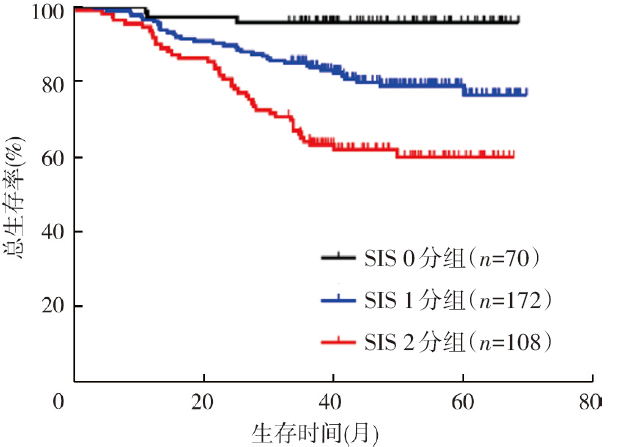 | 临床病理特征 | 例数 | SIS 0分组(n=70) | SIS 1分组(n=172) | SIS 2分组(n=108) | χ2值 | P值 |