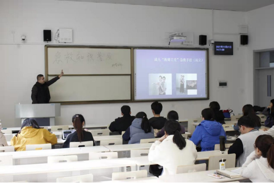 活动开始,张超伟首先向同学们强调了急救知识在生活中的重要性。讲解到海姆立克急救法内容时,他重点介绍了对于不同类型的人,进行抢救时不同的手法和操作要点。还邀请了自告奋勇的同学上台作为真人模型为同学们演示了不同类型的具体抢救操作手法。