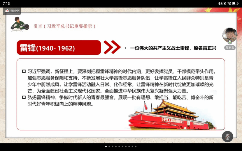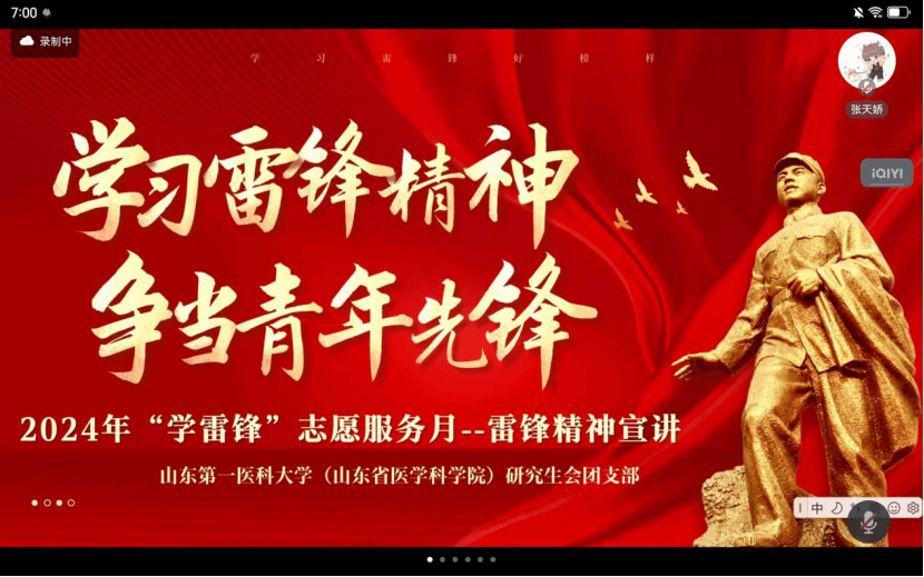 活动旨在回顾雷锋同志的生平事迹,解读雷锋精神内涵,同时分享新时代青年传承雷锋精神的典型案例,激发广大研究生团员青年学习雷锋精神的热情,为建设美好社会贡献医学研究生的青春力量。活动由研究生会团支部书记周明月主持,研究生部300多名团员青年以线上形式参与活动。
