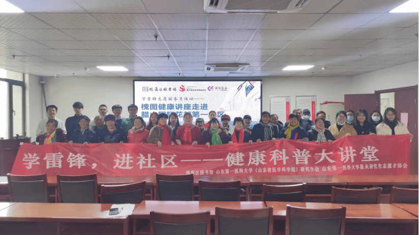 为弘扬社会主义核心价值观,深刻把握雷锋精神的时代内涵,进一步增强广大居民群众的自我保健意识,培育文明健康的生活方式,研究生会、“星火”志愿者协会联合槐荫区图书馆于3月3日在腊山街道国际花都第一社区党群服务中心联合举办了学雷锋,进社区——健康科普大讲堂活动。