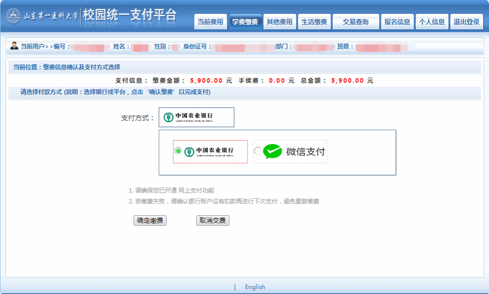 登陆支付平台后,点击导航栏的个人信息按钮,显示个人信息确认及维护界面。如图3.2-1 所示。请确认个人信息无误后再进行缴费,避免误交费。