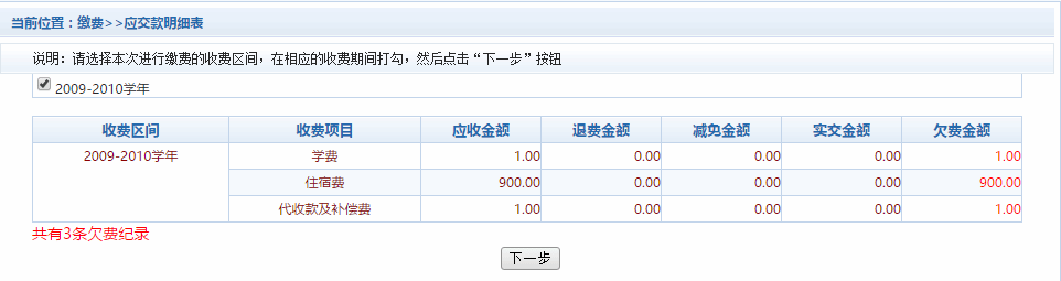 点击导航栏的“学费缴费”按钮,显示学费欠费和选择页面,如图 3.4-1 所示: