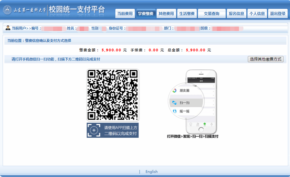 支付平台主要包括的功能有:个人信息管理、欠费查询、学费缴费、其他缴费、缴费记录查询、已缴费信息查询以及项目报名。