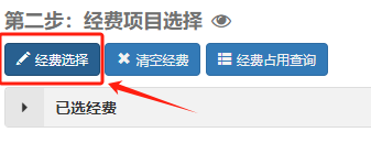 点击“清空经费”对已经选择的财务项目进行删除,点击“经费占用查询”对已选财务项目的经费占用情况进行查询。