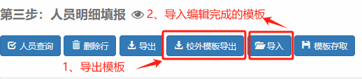 如果人员过多,可采用批量的方式导入。点击“校外模板导出”按钮下载模板,对模板进行编辑,编辑完成后点击“导入”按钮导入。