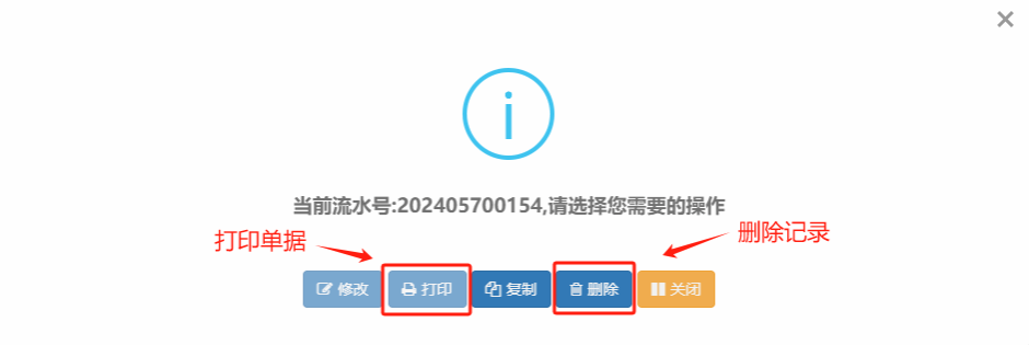 点击“查看”审批流程,可以实时查询单据审批状态。单位负责人完成审批,审核状态变成“审核完成”后,选择“更多操作”,打印单据;如需要删除该笔记录,点击“删除”按钮进行删除。