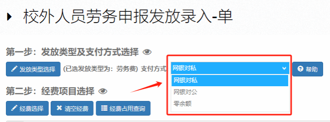 根据经费来源点击支付方式右边的下拉框选择对应的发放方式。