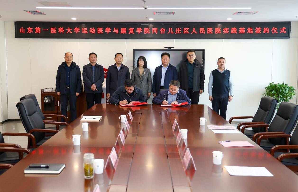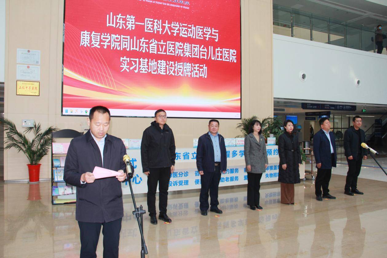 12月9日,运动医学与康复学院与山东省立医院集团台儿庄医院实习就业基地建设活动在台儿庄医院门诊大厅隆重举行。台儿庄区政府党组成员、副区长付晓娟,区卫健局党组书记、局长周长宏,山东省立医院集团台儿庄医院党委书记王建斌,学院党委书记孙建翠,学院党委委员、副院长程厚文,医院全体中层干部出席活动。活动由山东省立医院集团台儿庄医院院长王允山主持。