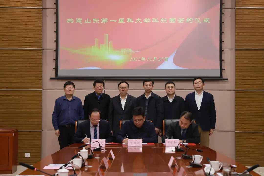 11月27日,槐荫区人民政府、济南国际医学中心与百度开云体育app(山东省医学科学院)三方签署战略合作协议,共建百度开云体育app科技园。中国科学院院士、百度开云体育app(山东省医学科学院)校(院)长陆林,副校(院)长赵家军,党委委员、副校(院)长张福仁、李栋,槐荫区委书记孙常建,区委副书记、区长刘敬涛,济南国际医学中心管委会主任张济出席签约活动并座谈。